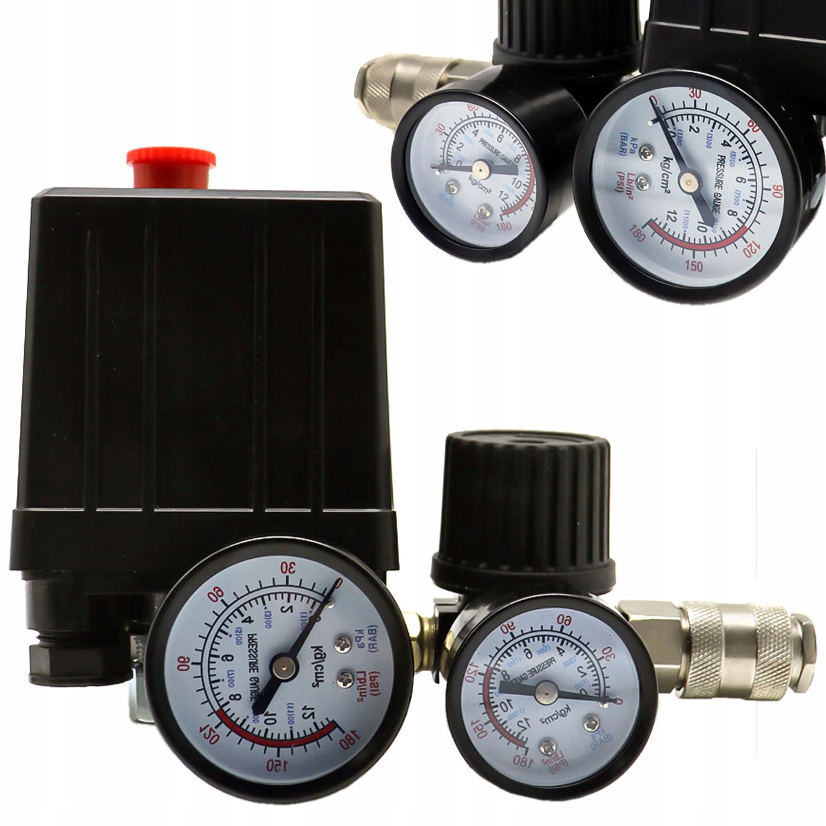 Високоякісний реле тиску (реле тиску) з колектором, двома швидкими з'єднувачами та манометрами, призначене для компресорів 230В.