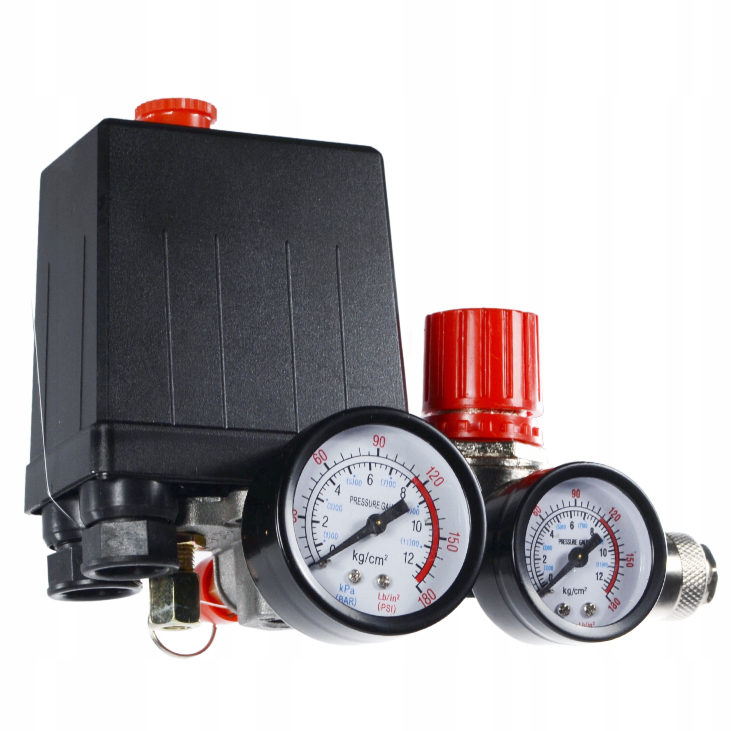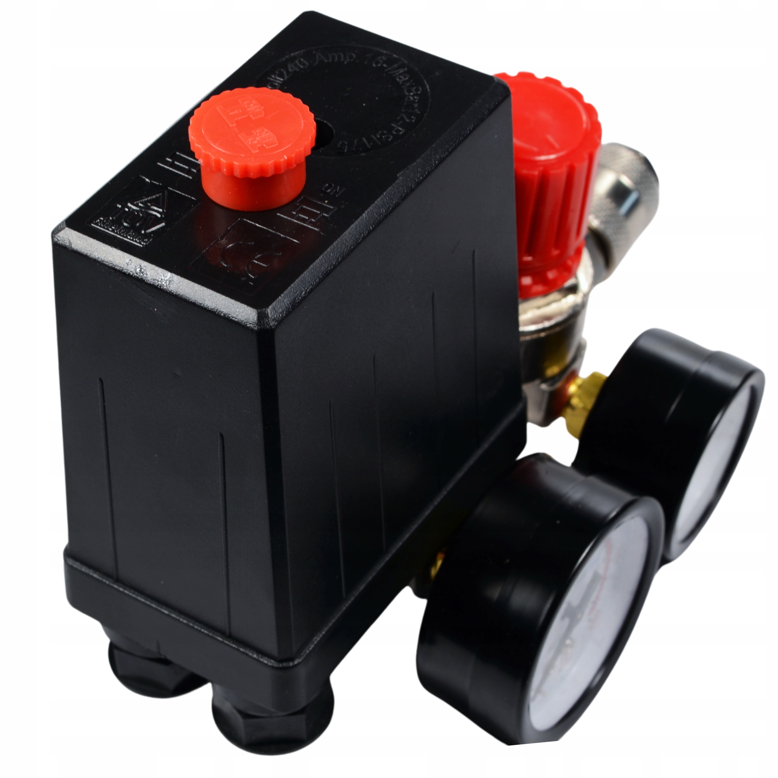Високоякісний реле тиску (реле тиску) з колектором, двома швидкими з'єднувачами та манометрами для однофазних компресорів 230В.