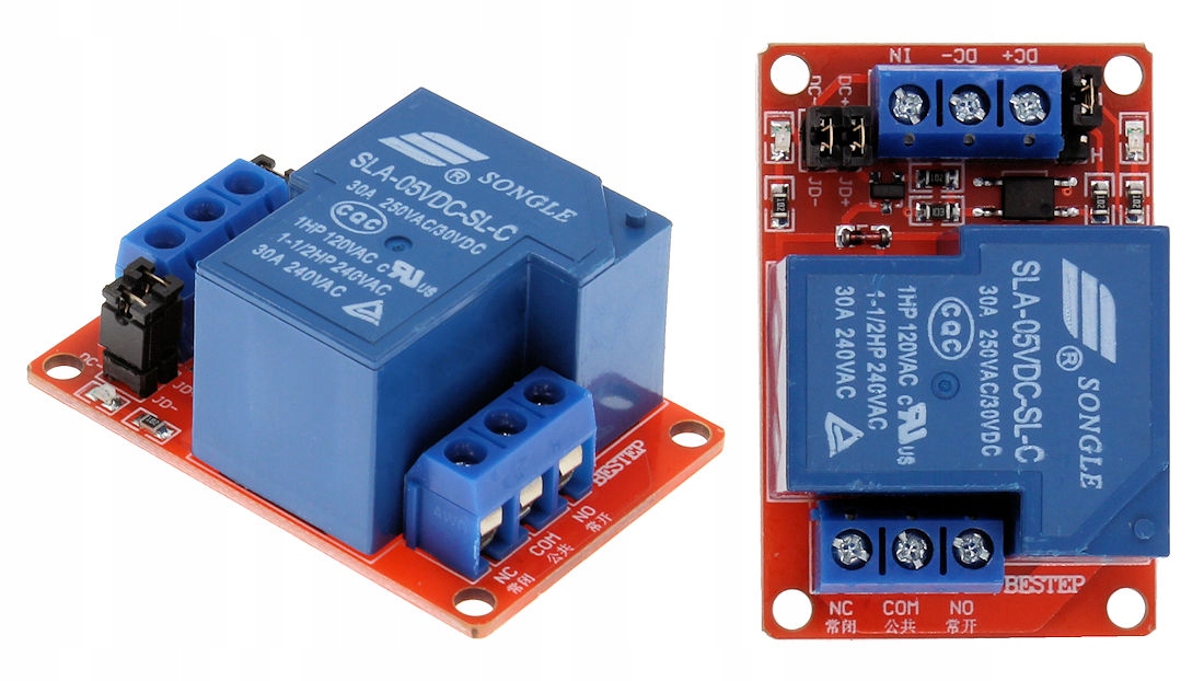 Універсальний 1-канальний релейний модуль з живленням 5В. Він оснащений реле 30A 250VAC / 30VDC. Можливість контролювати високий або низький стан. На платі є 2 світлодіоди, що вказують на стан реле. Підключаємо живлення до контактів DC+ (+12V) і DC- («маса») і подаємо керуючий сигнал на вхід IN. Модуль може контролювати високий або низький стан.