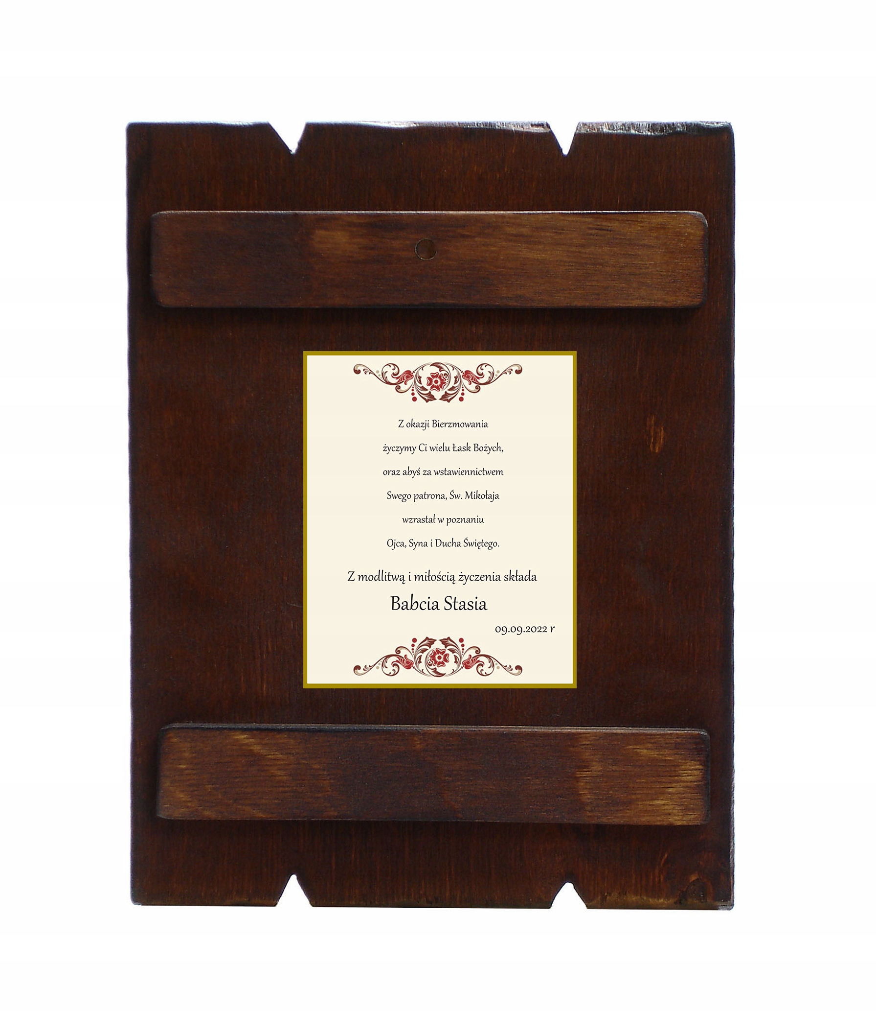 Посвята виготовлена на самоклеючому папері, завдяки чому ікона не жирний і не стирчить зі стіни. Папір закінчується золотою облямівкою. Присвяту на іконі ми ставимо самі. Значною мірою ми зосереджуємося на яскравих і радісних кольорах, щоб відобразити цю щасливу подію: Перше Святе Причастя, Весілля, Хрещення, Миропомазання чи ювілеї.