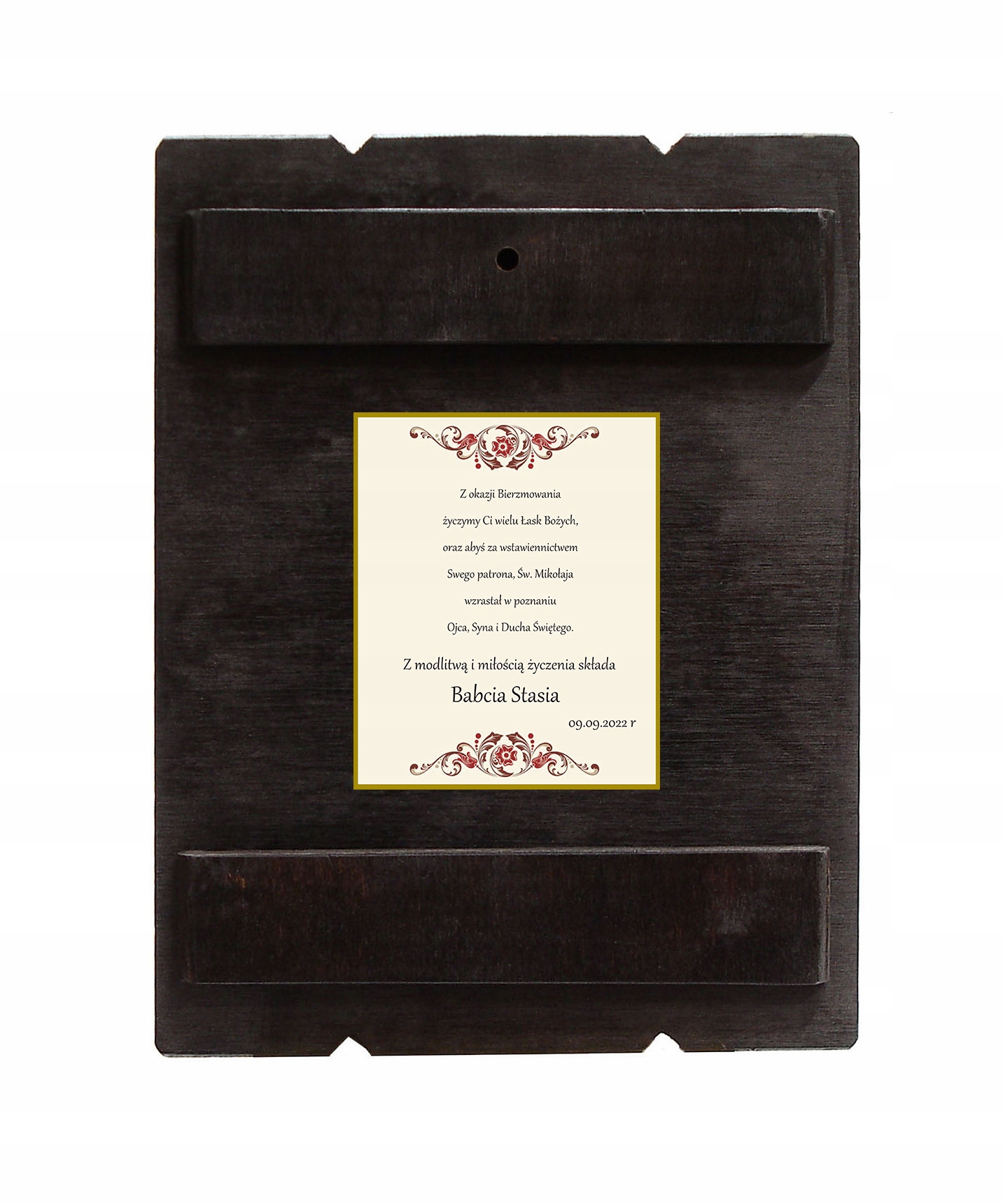 Посвята виготовлена на самоклеючому папері, завдяки чому ікона не жирний і не стирчить зі стіни. Папір закінчується золотою облямівкою. Присвяту на іконі ми ставимо самі. Значною мірою ми зосереджуємося на яскравих і радісних кольорах, щоб відобразити цю щасливу подію: Перше Святе Причастя, Весілля, Хрещення, Миропомазання чи ювілеї.