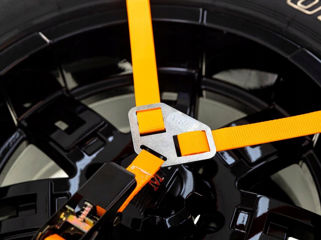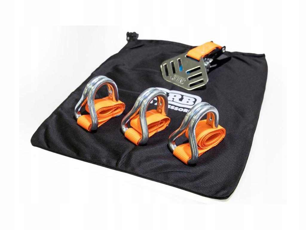 Універсальний комплект ременів з натягувачем, закінчується гачками для кріплення запаски до багажника. Люверси з кріпленнями до базової стійки, зображені на фото, є окремим продуктом (1780200) і їх можна придбати в нашому магазині.