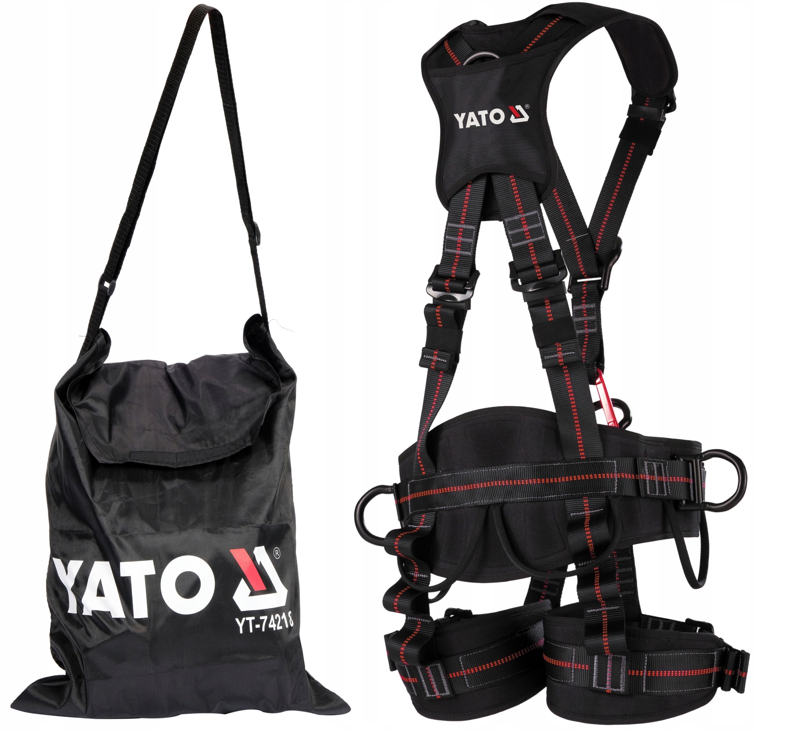 Ремені безпеки з стегновим ременем YT-74218 можна використовувати як елемент системи захисту від падіння, так і для роботи в підвішеному стані. Ремені є одними з найлегших у своєму класі, включаючи: завдяки алюмінієвим точкам кріплення. Сітчастий матеріал на плечових, стегнових і стегнових лямках, а також наповнення з піни EVA покращують комфорт, циркуляцію повітря та щільне прилягання до тіла. Правильно одягнені ремені повинні щільно прилягати до тулуба, талії та стегон, щоб мати можливість рівномірно розподіляти сили, що діють на тіло під час падіння, або комфортно працювати в підвішеному стані разом із спеціальною точкою кріплення.