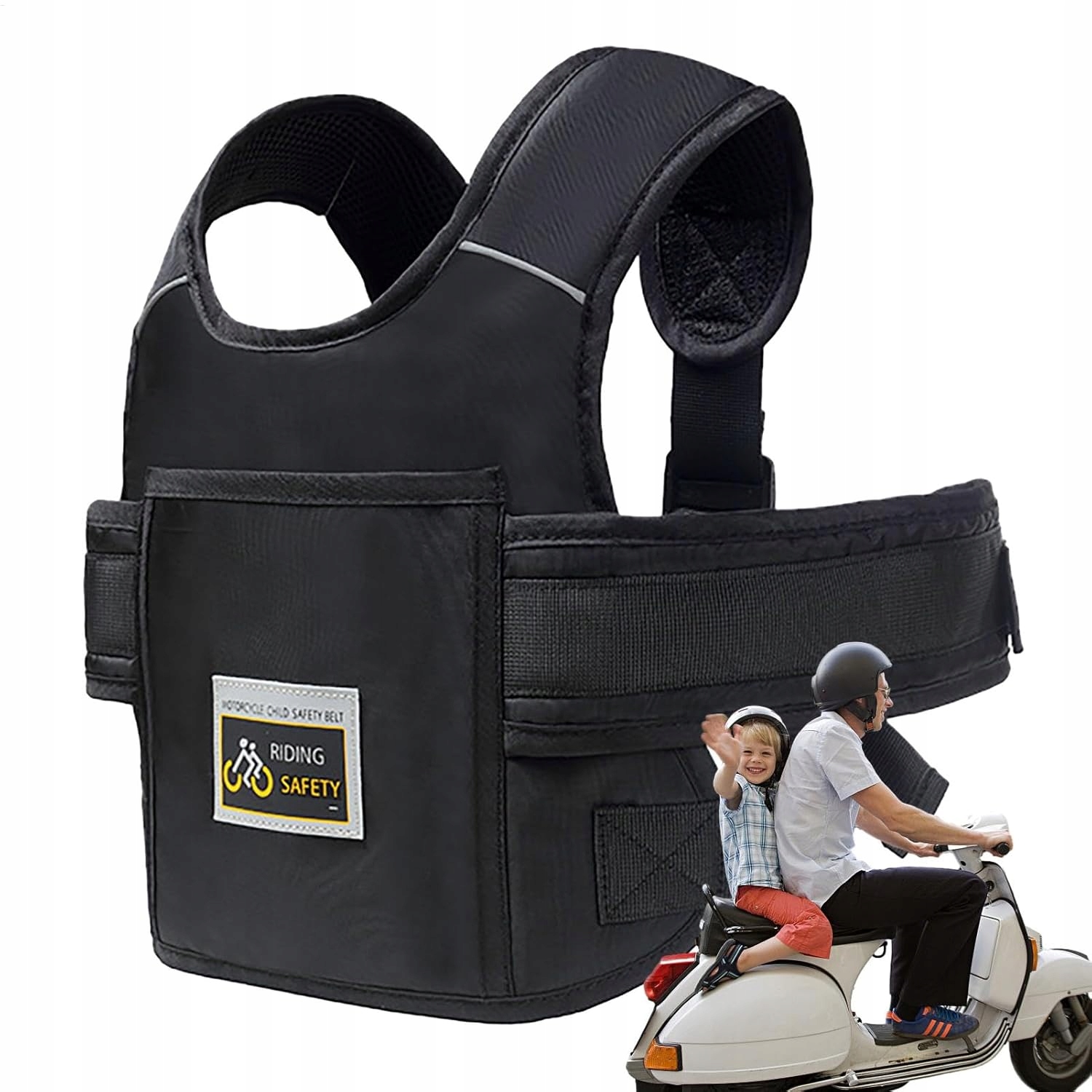 підходить для більшості мотоциклів, велосипедів, транспортних засобів та снігоходів. Він дуже ефективно тримає дитину в безпечному зв’язку з водієм, забезпечуючи йому безпеку.