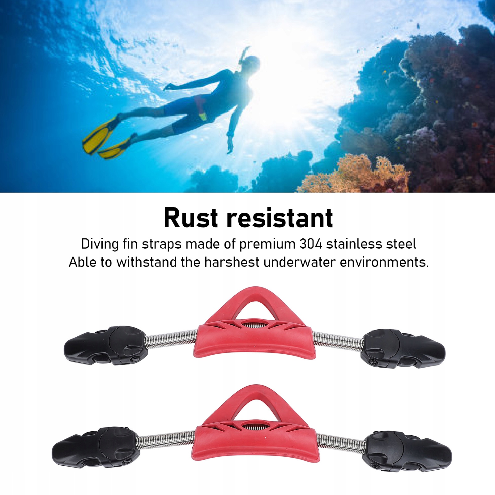 2. МАТЕРІАЛ З НЕРЖАВІЮЧОЇ СТАЛІ: ремінець для дайвінгу з пружинним плавником виготовлено з нержавіючої сталі найвищої якості 304, яка є стійкою до іржі та захищає від ерозії солоною водою. Завдяки чудовій міцності та довговічності він здатний витримувати найсуворіші підводні умови, забезпечуючи надійне та надійне кріплення ласт.