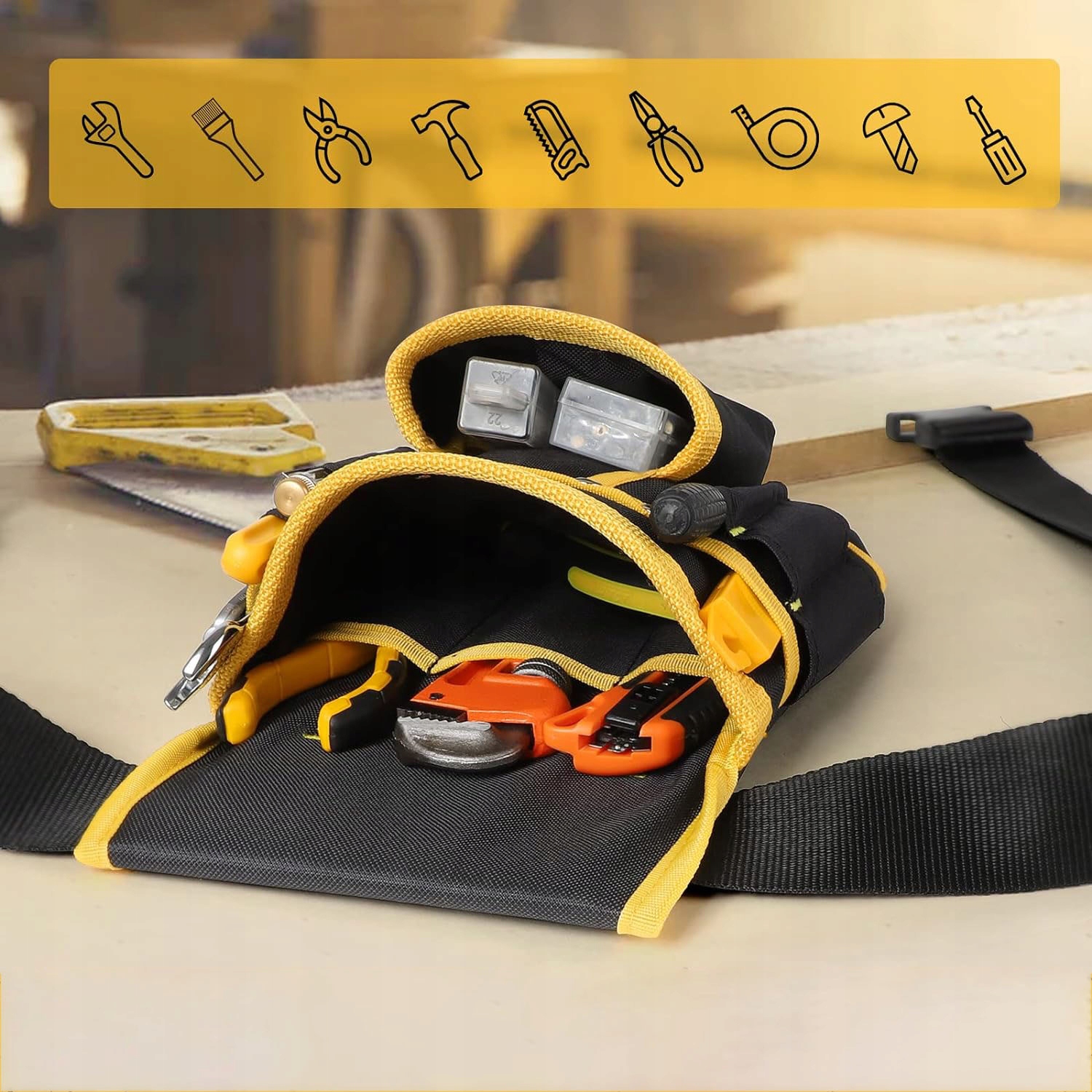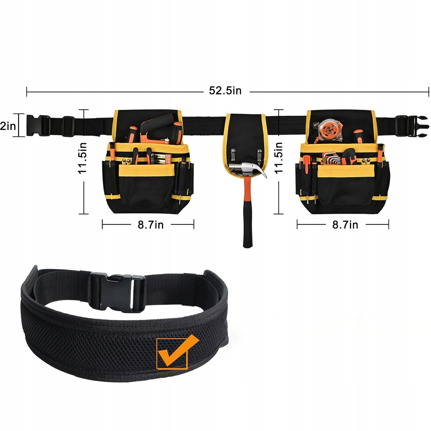 ✔️Всього 26 кишень для робочих інструментів. Достатньо місця для цвяхів, молотків, викруток, липких стрічок тощо. Розумне розташування кишень забезпечує ергономіку та не завадить вам.