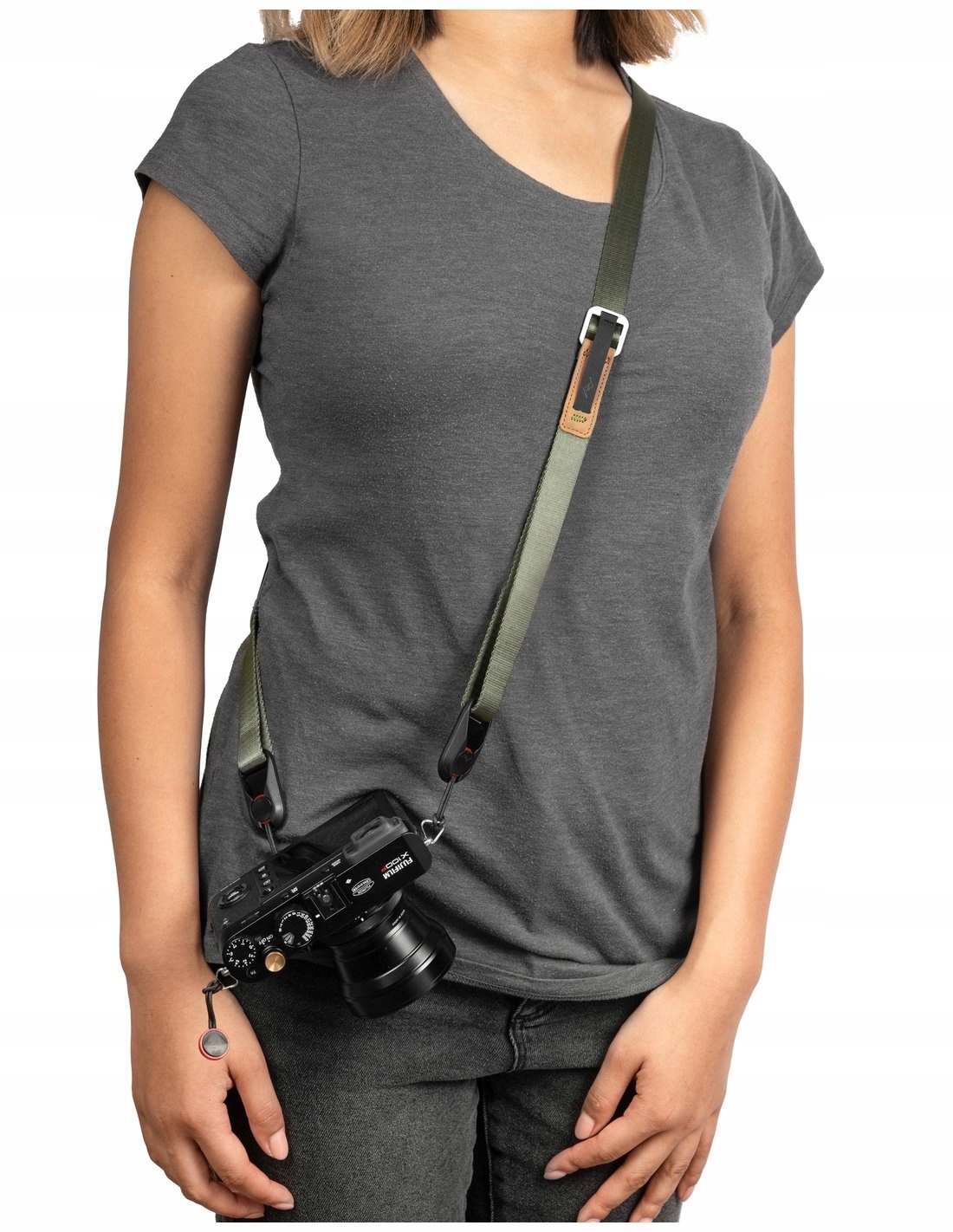 Діапазон довжини від 84 до 152 см. Довжина ремінця легко регулюється. Все, що вам потрібно, це одним потягненням за алюмінієву пряжку, яка використовує слизький матеріал, щоб плавно ковзати по поясу. Це дуже зручний спосіб ідеально адаптуватися до будь-якої ситуації та особистих уподобань користувача. Все відбувається миттєво, не зупиняючись і не знімаючи камери з шиї. Це рішення вже відомо користувачам вищих моделей ременів, таких як Slide і Slide Lite.