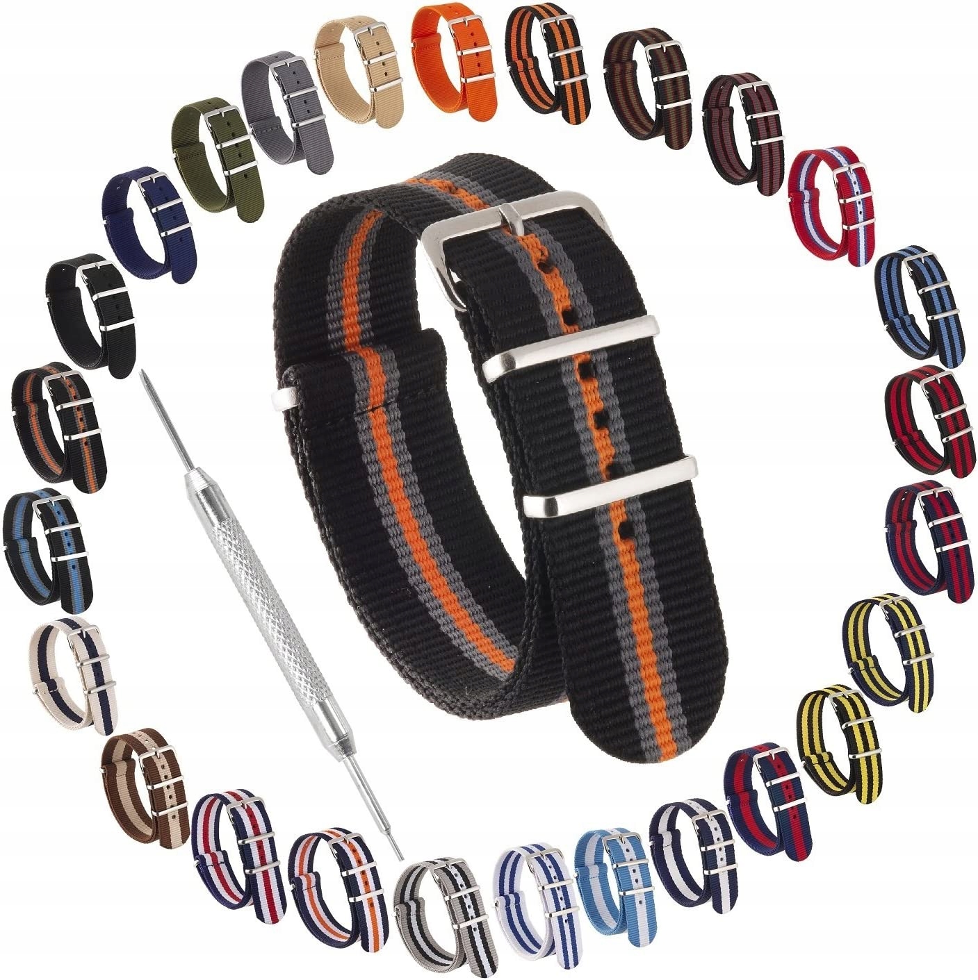 Цілісний ремінець НАТО для годинника. Смужки різних кольорів і візерунків. Швидка заміна. Ремені відповідно до події та вбрання. Клеєно-прошита, з'єднання 0,05 в хорошій якості. Міцна щільна нейлонова тканина. Оригінальний і правдивий дизайн. Доступна ширина ремінця 8 мм, 20 мм, 22 мм і 24 мм. Довжина 270 мм. Регулювання U20 3 підходить для більшості зап’ясть, не підходить для розумних годинників. Точний крой, вшиті пряжки та шлевки з нержавіючої сталі. У набір входить пістолет для знімання пружинних штифтів.