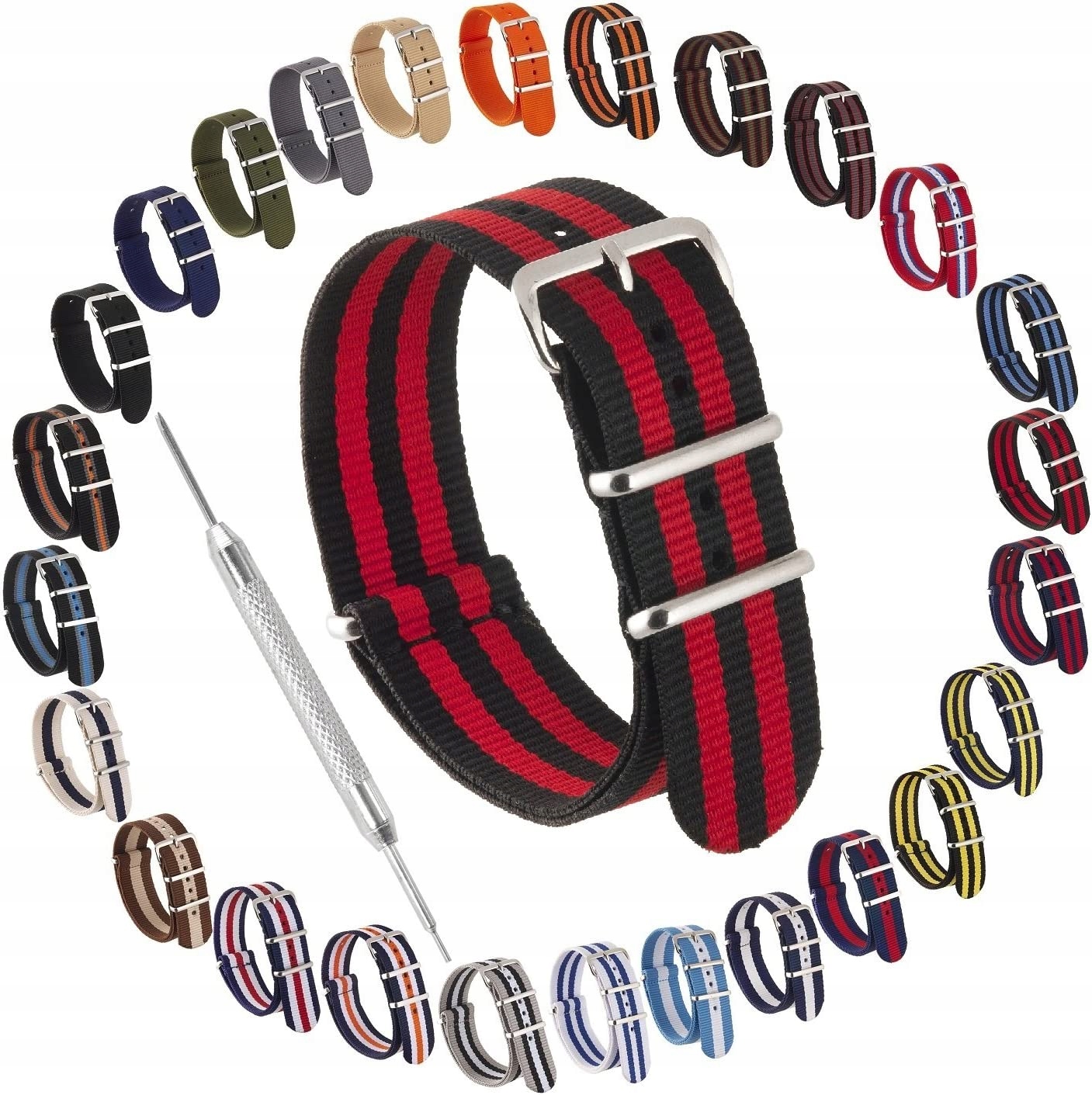 Цілісний ремінець НАТО для годинника. Смужки різних кольорів і візерунків. Швидка заміна. Ремені відповідно до події та вбрання. Клеєно-прошита, з'єднання 0,05 в хорошій якості. Міцна щільна нейлонова тканина. Оригінальний і правдивий дизайн. Доступна ширина ремінця 8 мм, 20 мм, 22 мм і 24 мм. Довжина 270 мм. Регулювання U20 3 підходить для більшості зап’ясть, не підходить для розумних годинників. Точний крой, вшиті пряжки та шлевки з нержавіючої сталі. У набір входить пістолет для знімання пружинних штифтів.