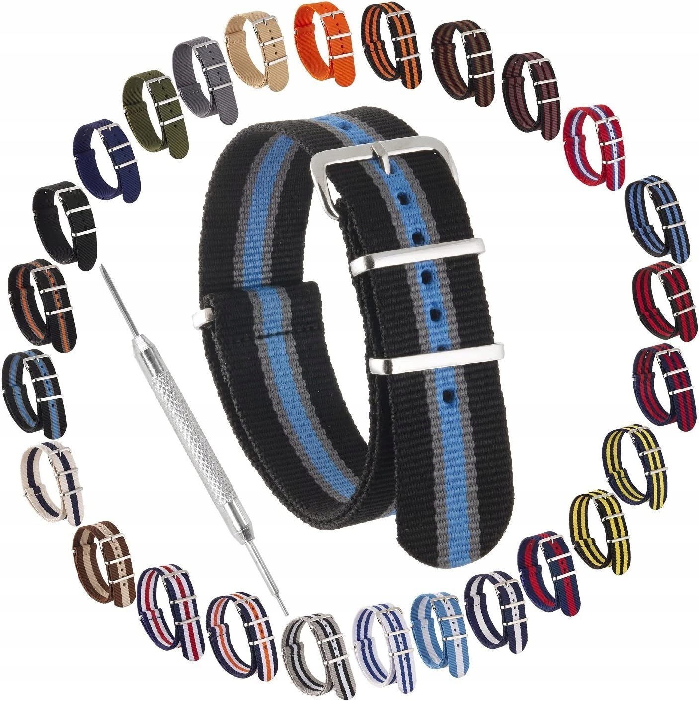 Цілісний ремінець НАТО для годинника. Смужки різних кольорів і візерунків. Швидка заміна. Ремені відповідно до події та вбрання. Клеєно-прошита, з'єднання 0,05 в хорошій якості. Міцна щільна нейлонова тканина. Оригінальний і правдивий дизайн. Доступна ширина ремінця 8 мм, 20 мм, 22 мм і 24 мм. Довжина 270 мм. Регулювання U20 3 підходить для більшості зап’ясть, не підходить для розумних годинників. Точний крой, вшиті пряжки та шлевки з нержавіючої сталі. У набір входить пістолет для знімання пружинних штифтів.
