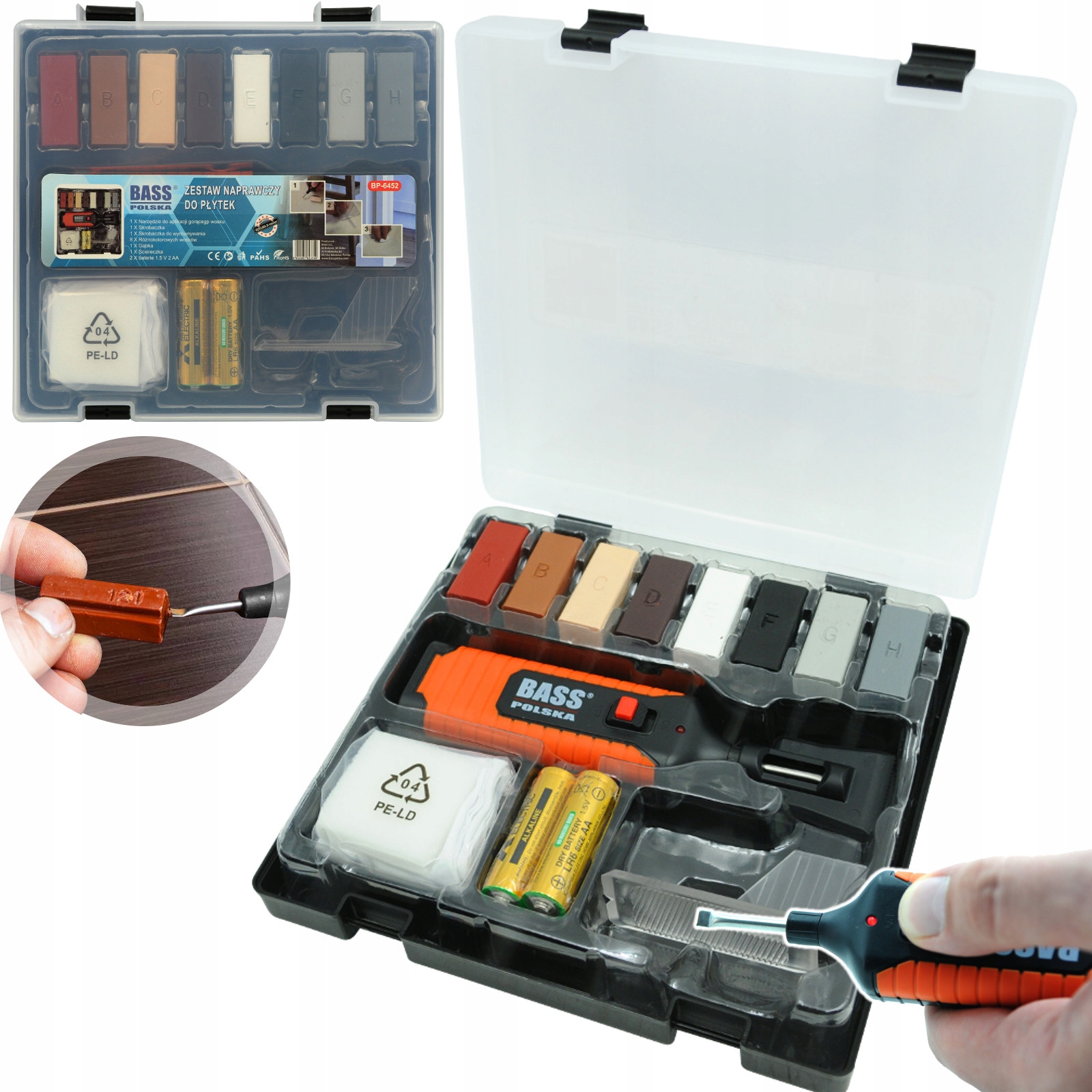 Набір дозволяє самостійно усунути пошкодження на кам'яних і керамічних поверхнях. Його також можна використовувати для ремонту пошкоджень паркетної підлоги, панелей підлоги та меблів, залежно від вибору бажаного кольору наповнення.