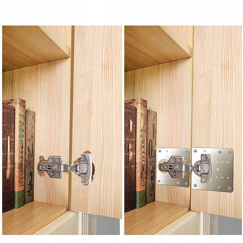 Універсальна пластина для ремонту петлі. Завдяки численним отворам він підійде для більшості меблів. Виріб універсальний як для лівої, так і для правої сторони петлі. Крім того, ми додаємо гвинти, щоб легко та швидко відремонтувати петлі та вирішити проблему.