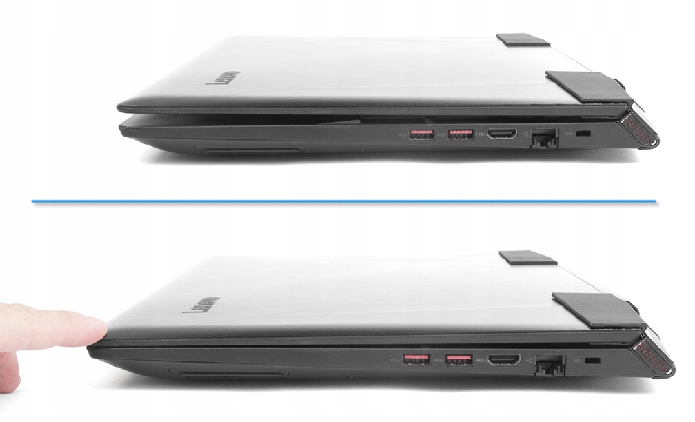 Завдяки дизайну ноутбука та товщині затискачів після закриття ноутбука залишається невеликий зазор, який не впливає на використання пристрою (легке натискання рукою повністю закриває кришку).