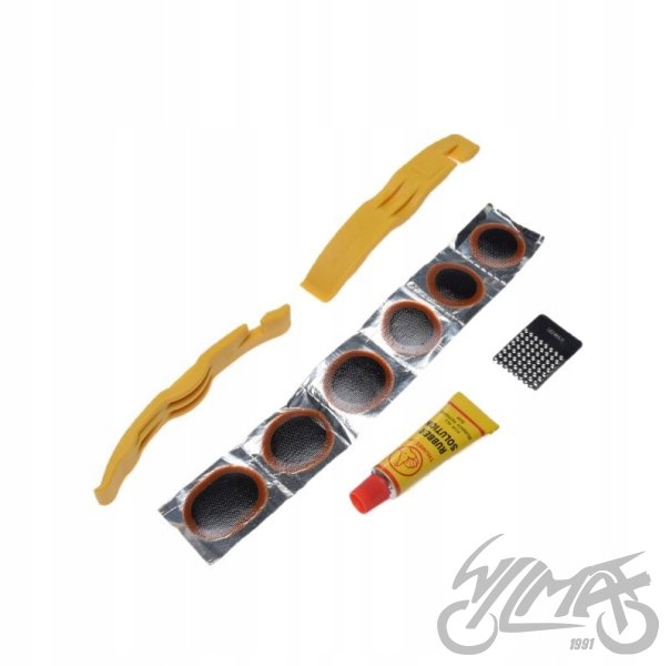 Набір: клей 5 мл, латки 3 х 20 мм, 2 х 25 мм, 30 мм х 20 мм, металева пластина, 2 важелі для шин