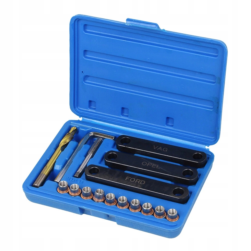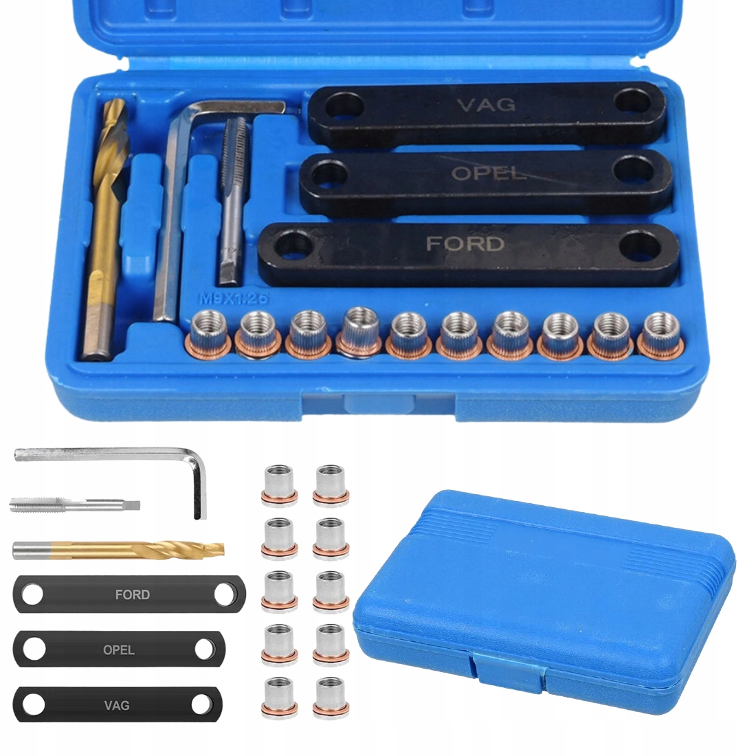 Включає мітчик M9x1,25 для ремонту незначно пошкодженої різьби. Включає шаблон для свердління для автомобілів VW, Opel і Ford. Включає шестигранний ключ на 7 мм для загвинчування та відкручування напрямних гвинтів. Поставляється в практичному кейсі.