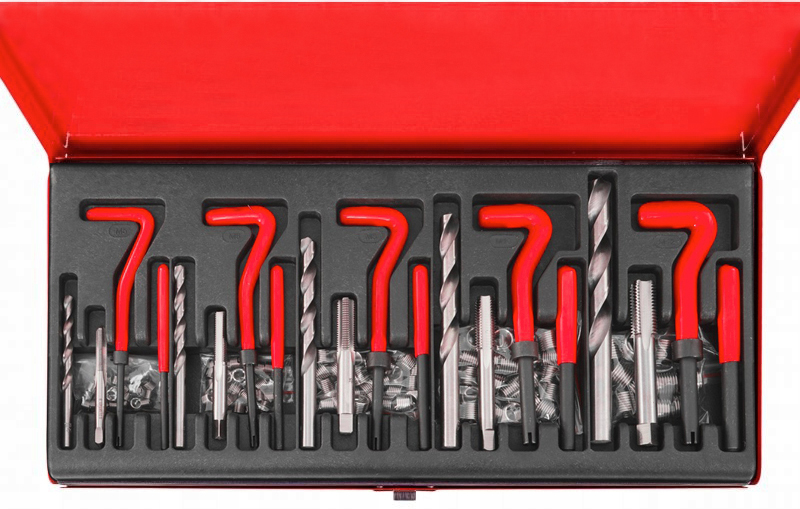 Високоякісний набір для ремонту різьби, який дозволяє замінити пошкоджену різьбу новою різьбовою вставкою. Свердла та мітчики виготовлені з швидкорізальної сталі HSS. Одноступінчасті мітчики нарізають різьбу, в яку вставляється спіральна вставка з твердої нержавіючої сталі. Вставка вставляється за допомогою направляючої ручки та пуансона, який ламає виступаючий кінчик вставки.