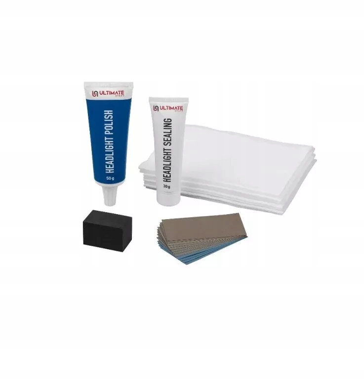 - Вміст набору: 1 тюбик полірувальної пасти для фар (50 г), 1 тюбик захисного покриття для фар (30 г), 4 полірувальні серветки, 4 2000 абразивних смужок, 4 3000 абразивних смужок, 4 5000 абразивних смужок, 1 полірувальний блок