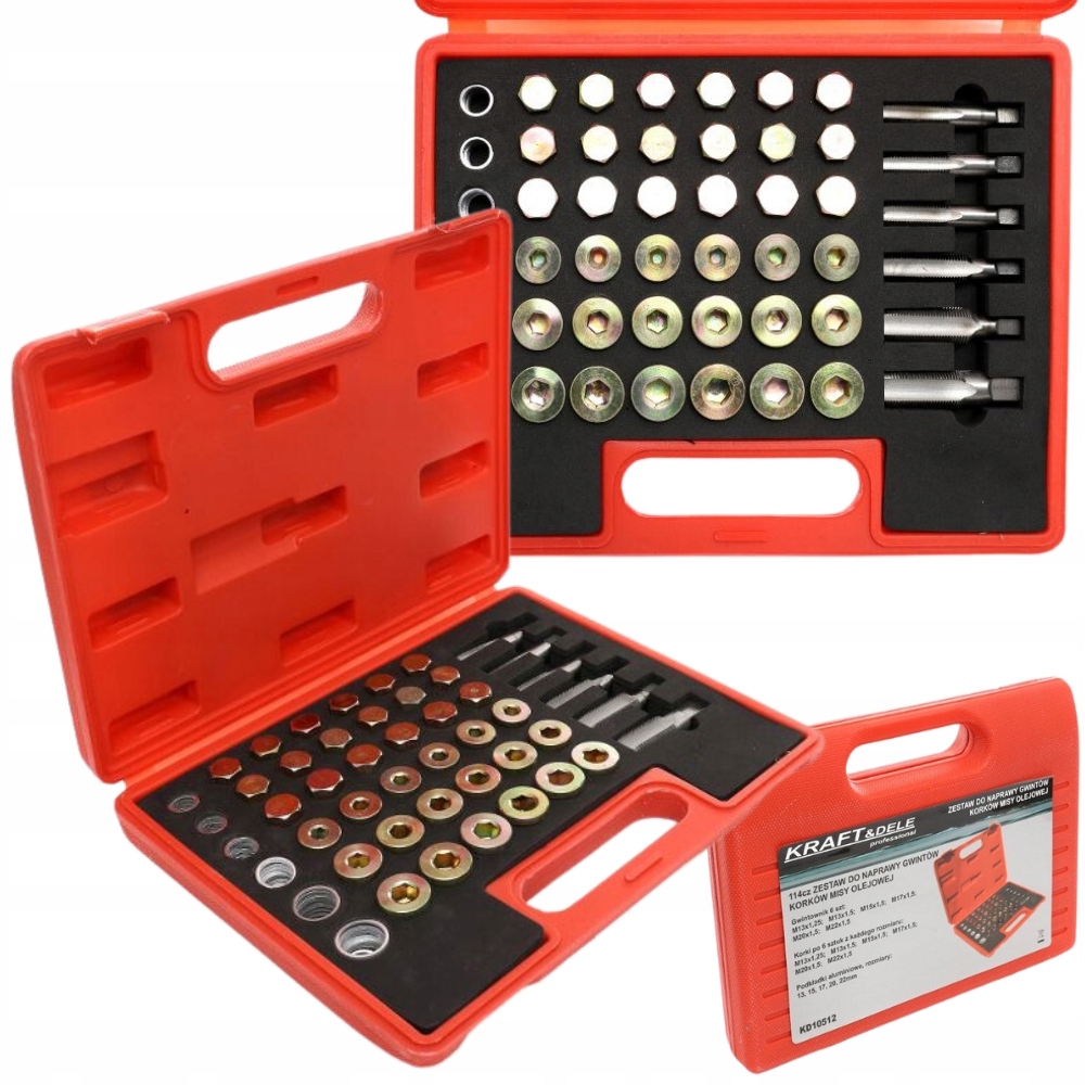 Цей набір, що складається зі 114 частин, включаючи різноманітні крани та заглушки, дозволяє швидко й ефективно відремонтувати різьблення зливних пробок масляного піддону, трансмісій та інших компонентів, підходячи до більшості різьб, що використовуються в легкових автомобілях і легких вантажівках.