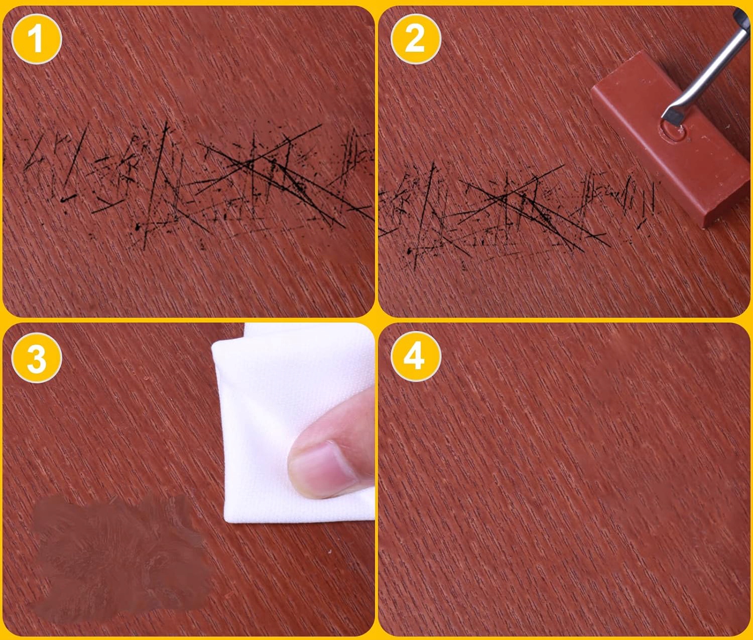 Ремонтний набір рекомендовано для ремонту дрібних подряпин на ламінованих підлогах, стільницях, меблях, шафах, дереві, віконних рамах тощо.