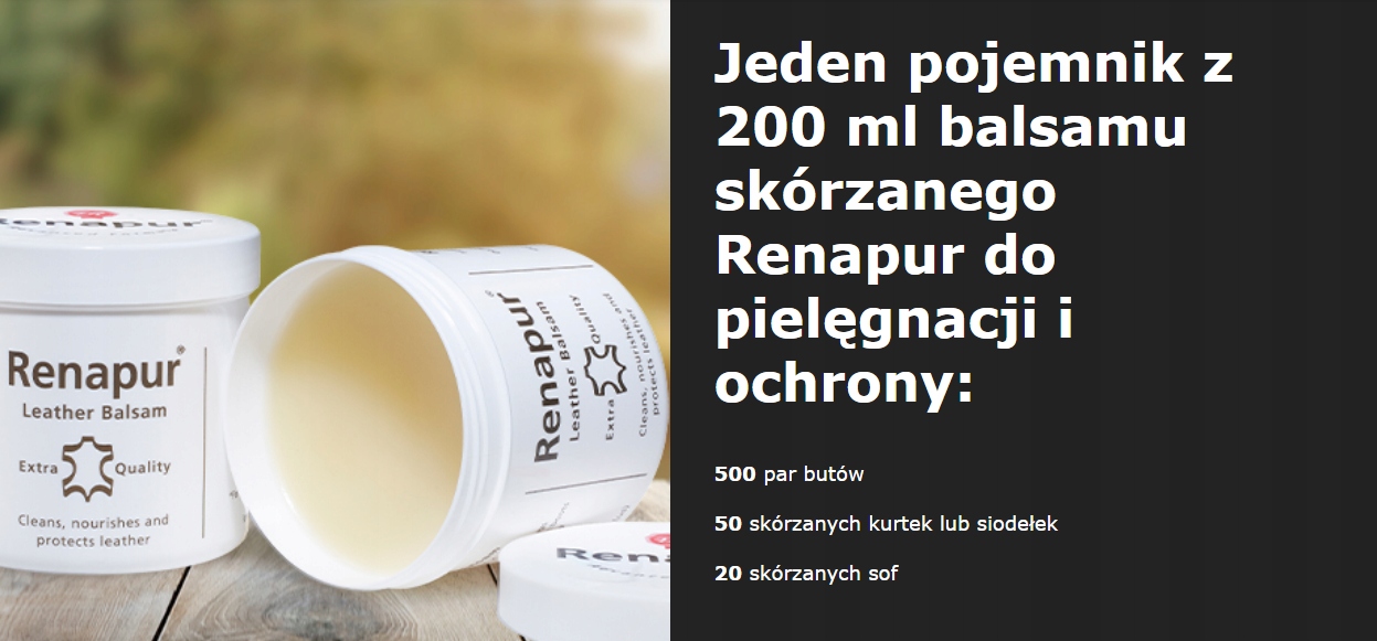 НЕ ВИКОРИСТОВУЙТЕ ДЛЯ ЗАМШІ (не плутати зі спилок) ТА КАМЕРИ. Бальзам для натуральної шкіри Renapur тримається довго та є економічним у використанні. Один пакет, напр. 200 мл достатньо для підтримки та захисту до 500 пар взуття, 50 шкіряних курток або 10 застосувань на шкіряних сидіннях автомобіля.