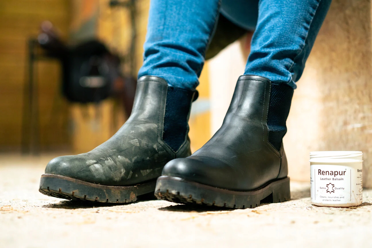 Якщо ви використовуєте бальзам Renapur для догляду за своїми черевиками та черевиками, вам не потрібно спочатку очищати їх нашим очисником, якщо тільки бруд не проник всередину шкіра. Renapur Leather Balsam може впоратися з невеликою кількістю бруду або бруду, який просто розтане зі шкіри та впаде на губку. Ви навіть можете наносити Renapur Balsam на вологу шкіру.