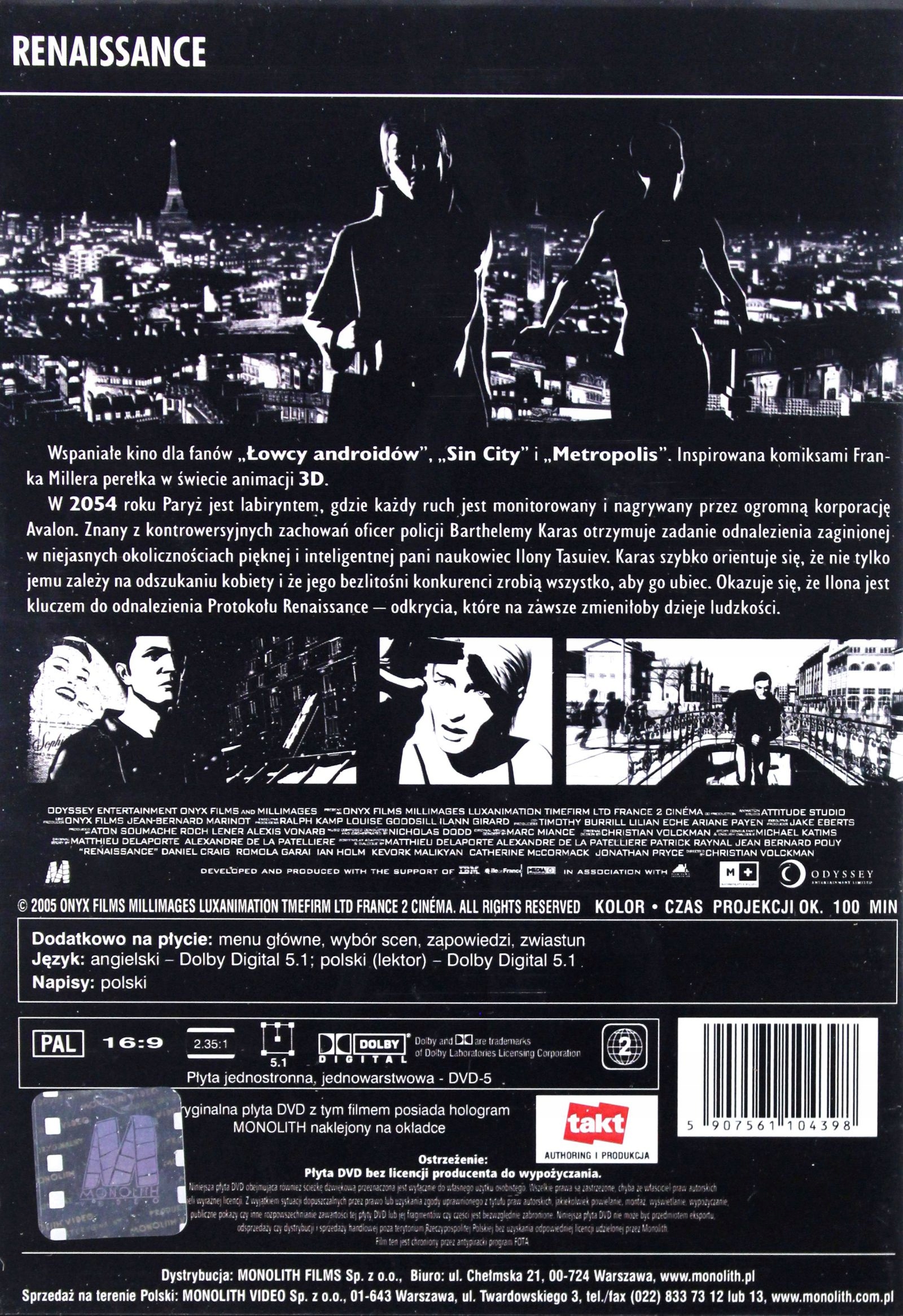 Чудовий фільм для шанувальників «Той, що біжить по лезу», «Місто гріхів» і «Метрополіс». Натхненний коміксами Френка Міллера, перлина у світі 3D-анімації. У 2054 році Париж це лабіринт, де кожен рух контролюється та записується величезною корпорацією Avalon.Бартелемі Карас, поліцейський, відомий своєю суперечливою поведінкою, отримує завдання знайти красиву та розумну вчену Ілону Тасуєву, яка зникла за нез’ясованих обставин.Карас швидко розуміє що він не єдиний, хто хоче знайти цю жінку, і що його безжальні конкуренти зроблять те саме.все, щоб перешкодити йому.Виявляється, Ілона є ключем до пошуку Протоколу Ренесансу - відкриття, яке змінило б історію людство назавжди