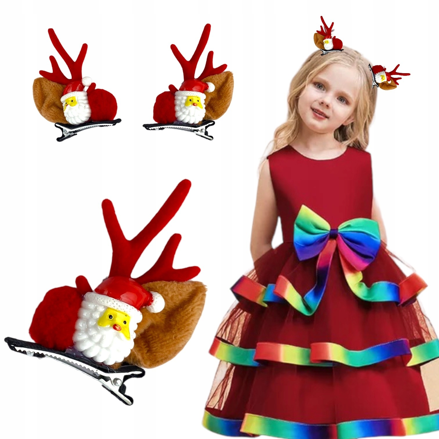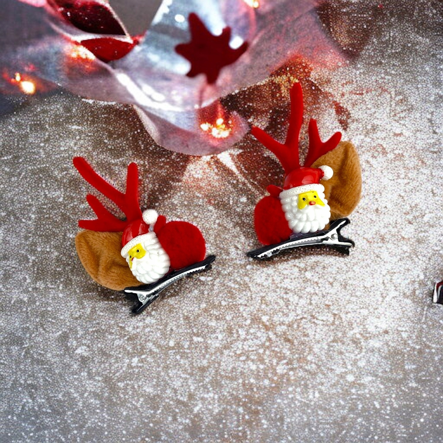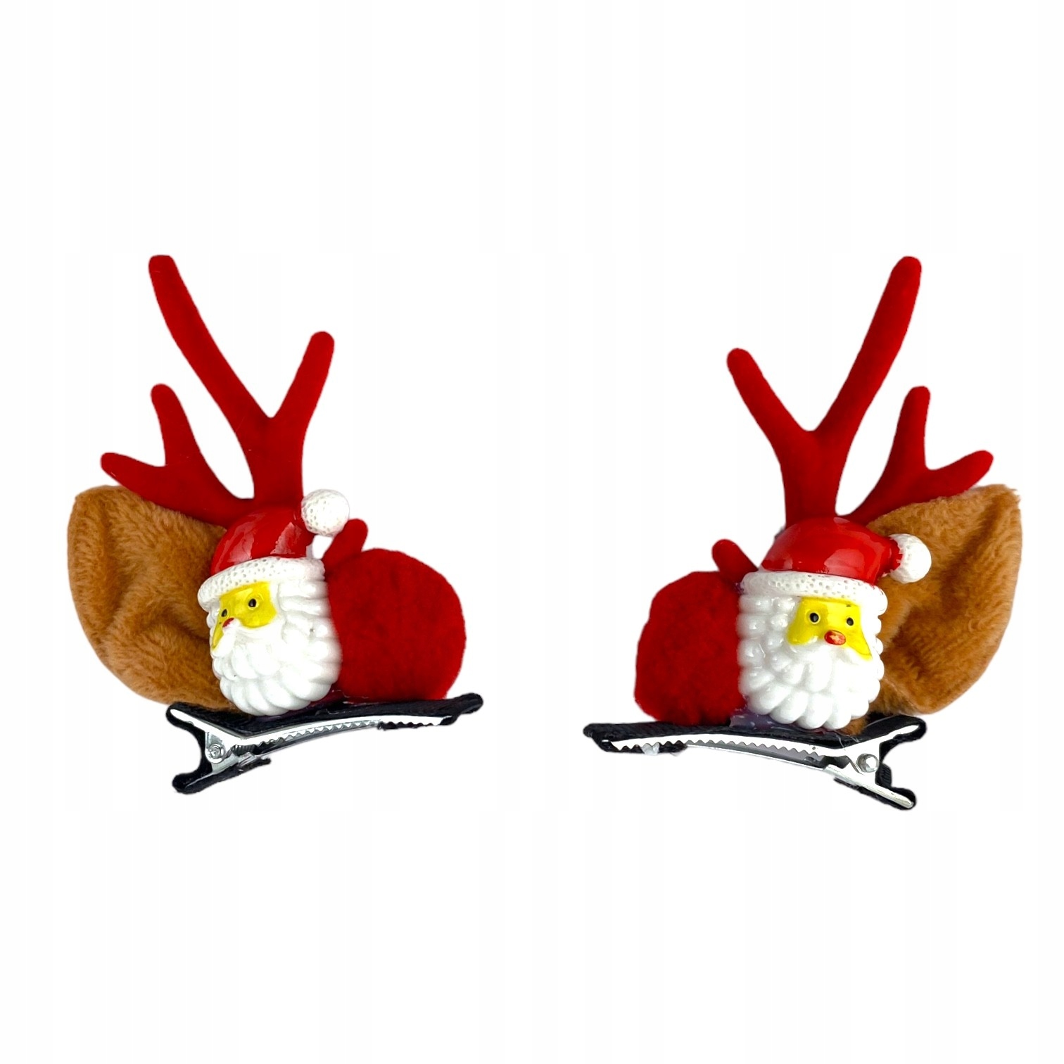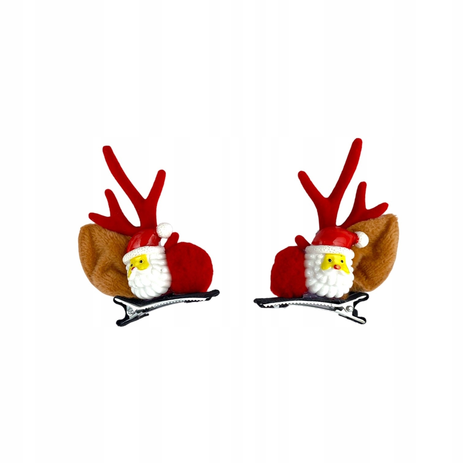 Набір різдвяних кліпів волосся з мотивом Ніколаса та оленів - ідеальне доповнення до різдвяних стилізацій! Кожен кліп представляє чарівний Санта з червоними, м'якими рогами та хутряними вухами, які додають цілу святкову чарівність.