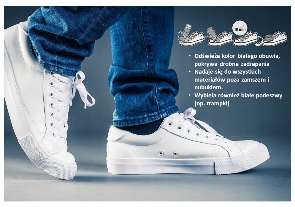 Рідина призначена для білого взуття. Освіжає білий колір, приховує дрібні подряпини та потертості, завдяки чому взуття виглядає як нове. Також підходить для гумових підошв (наприклад, кросівок).
