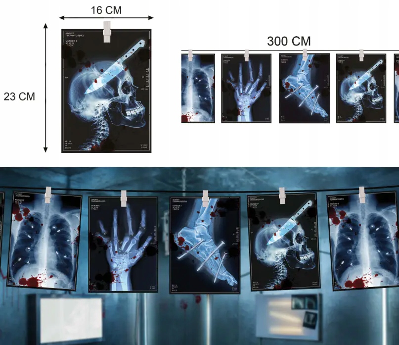 Радіографічна гірлянда у вигляді фотографій — ідеальна прикраса на Хеллоуїн, яка створить похмуру атмосферу прямо з фільму жахів у вашому домі чи приміщенні. Прикраса довжиною 300 см складається з елементів розміром 16x22 см, що нагадують рентгенівські знімки - ідеальне натхнення для створення неповторної атмосфери жаху під час вечірки, костюмованої вечірки або оформлення тематичної кімнати.