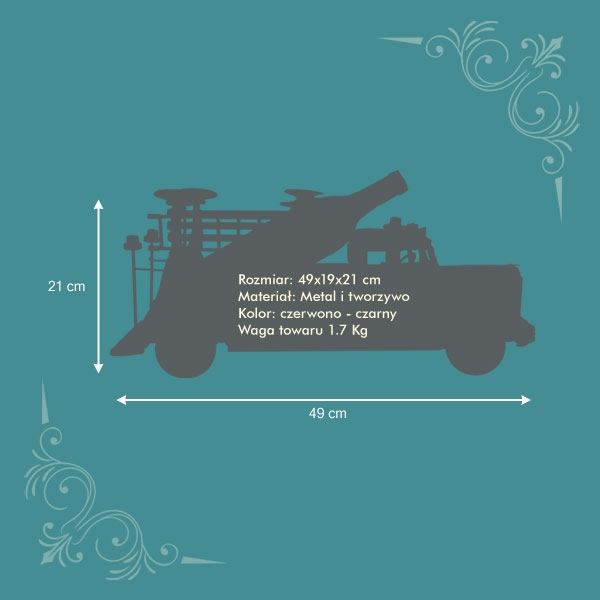 - Розмір: висота 21, ширина 19 см, довжина 49 см