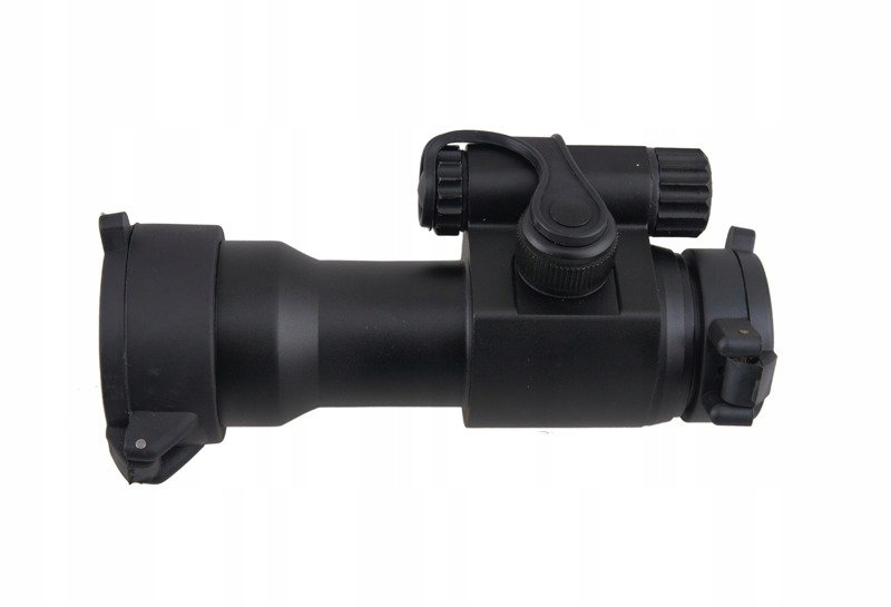 Коліматор CompM2 з плавним регулюванням положення (за допомогою двох ручок) і регулюванням яскравості точки прицілювання. Сама точка прицілювання — це червона точка.