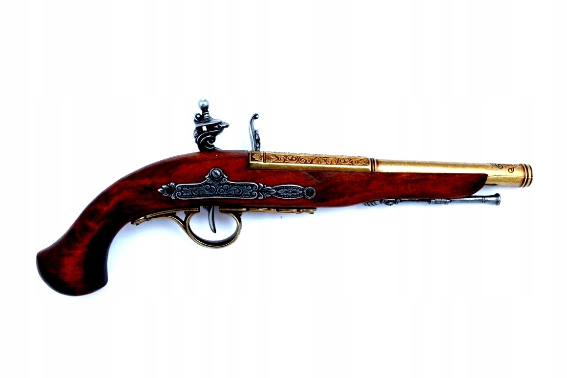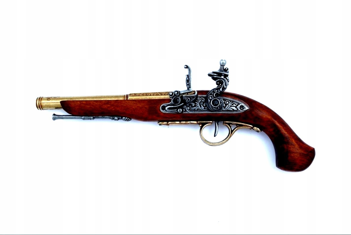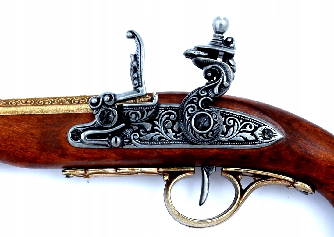 Репліка, виготовлена з комбінації дерева та металу — сплаву цинку та алюмінію. Дерев'яна ложа, профільована на кінці в зручну ручку. Делікатно вигравіруваний ствол. Елегантний замок, який дозволяє дізнатися, як працюють крем’яні рушниці. Ти б’єш молотком каменем, натискаєш на спусковий гачок, молоток падає на кремінь. Репліка абсолютно безпечна - дозволяє вести сухий постріл, заряджати зброю не можна. Механізм копії не воскрешає іскру! Все це виглядає дуже солідно і дуже добре відображає простоту та функціональність цього типу зброї. Можна згадати два цікавих факти про кремінні пістолети. Неодноразово при пострілі порох на сковороді горів без перенесення вогню на ствол. І звідси вислів, що ідея провалилася. Однак назва всієї вогнепальної зброї «флінт» походить від назви різновиду забрудненого кварцу, який використовувався для каменів, який раніше називався кременем.