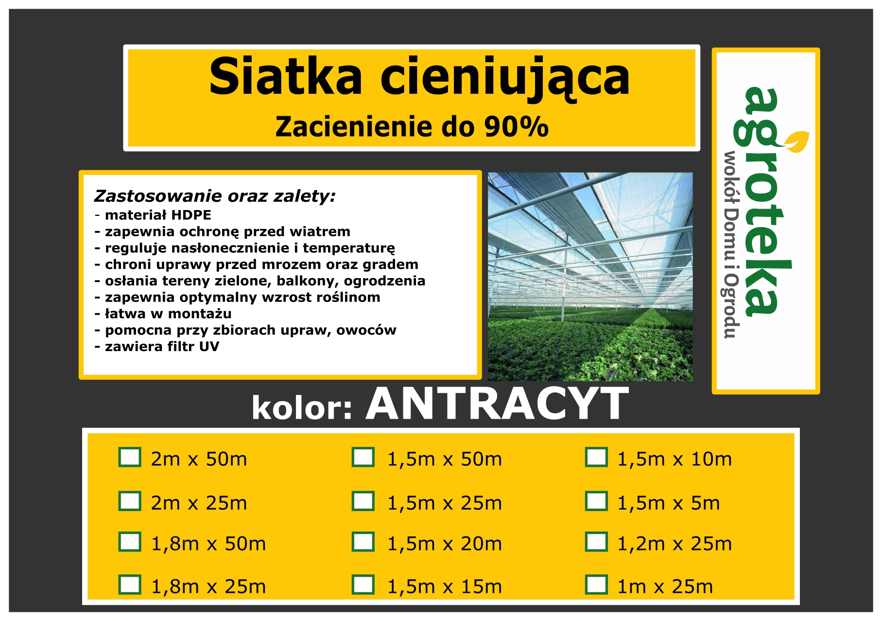 Щільноткана шторна сітка 90% — це захисна трикотажна тканина. Високоякісний продукт містить УФ-фільтр, який блокує до 90% світла. Сітка має посилені краї з отворами для зручності встановлення. Він забезпечує оптимальну вентиляцію і дозволяє ефективно регулювати сонячне світло і температуру. Завдяки цьому ви захистите свій посів від вітру, морозу, дощу та інших атмосферних явищ. Ідеально підходить для покриття зелених або рекреаційних зон (чудово працює як елемент огорожі для спортивних майданчиків). Він стійкий до хімікатів, які використовуються в садівництві, тому вам не доведеться турбуватися про його щорічну заміну. Надзвичайно корисний при вирощуванні фруктів. Це захищає їх від надлишку сонячного світла. Забезпечує оптимальний ріст рослин