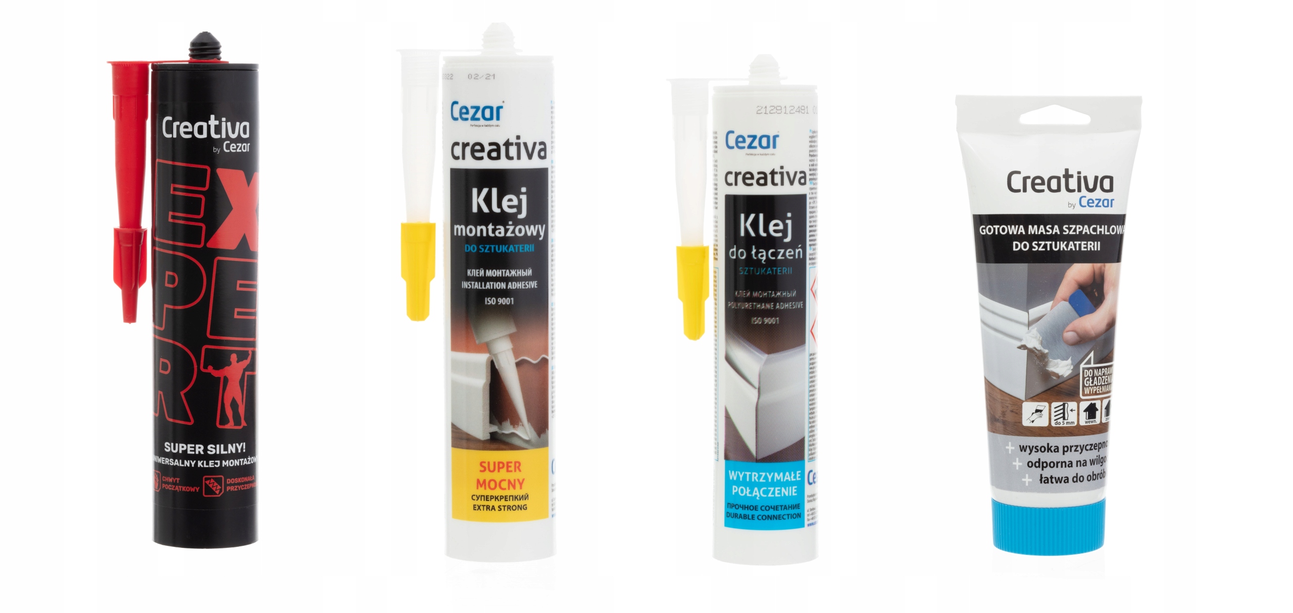 - Стяжки та ліпнину Creativa by Cezar монтують за допомогою монтажного клею C300 або клею Creativa EXPERT Super Silny. Залежно від основи, тюбика клею вистачає приблизно на 4 смуги. Нанесіть клей по довжині смужки. (ми ніколи не наносимо клей точково);