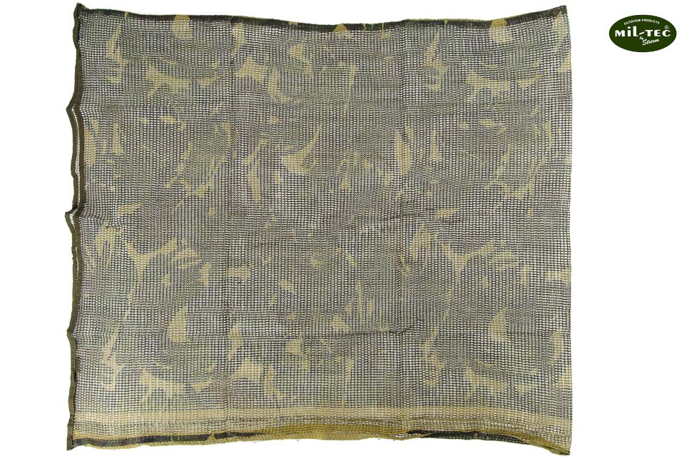 Виготовлений із плетеної сітки з великими вічками. Міцний 100% поліестеровий матеріал гарантує стійкість до зношування, прання та вицвітання. Він повітряний, швидко сохне, надає природний вигляд, не відбиває світло, не шелестить, а в згорнутому вигляді поміщається в кишеню. Можливість повісити сітку, наприклад, на спостережний пост або як маскування намету. Закриває всю фігуру. Він також працює як москітна сітка. Краї обрізані та захищені від розмотування.