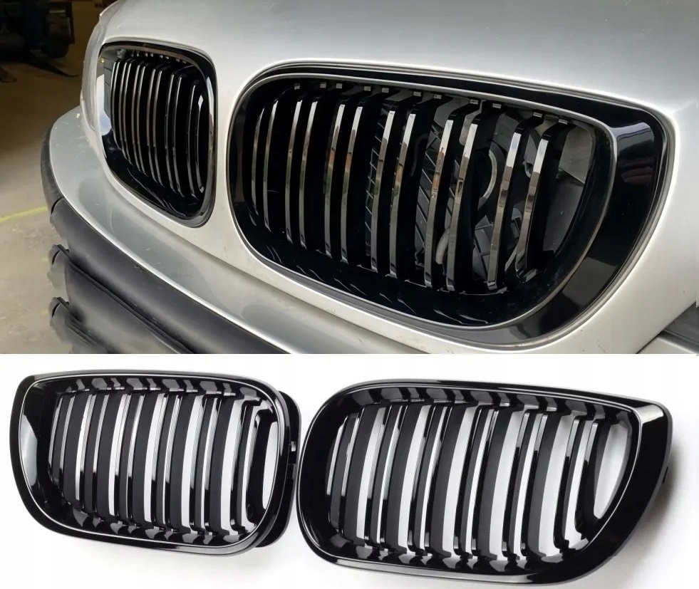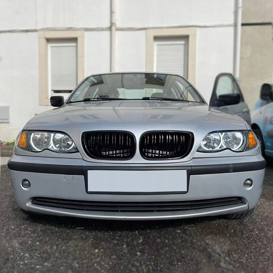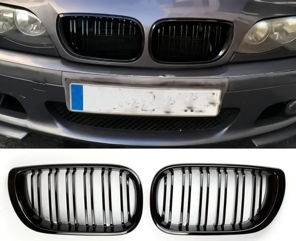 ➡️Предметом пропозиції є набір з двох муляжів між фарами ( нирки) в чорному глянці, призначений для BMW 3 E46 FL (після рестайлінгу) в версіях седан і універсал.
