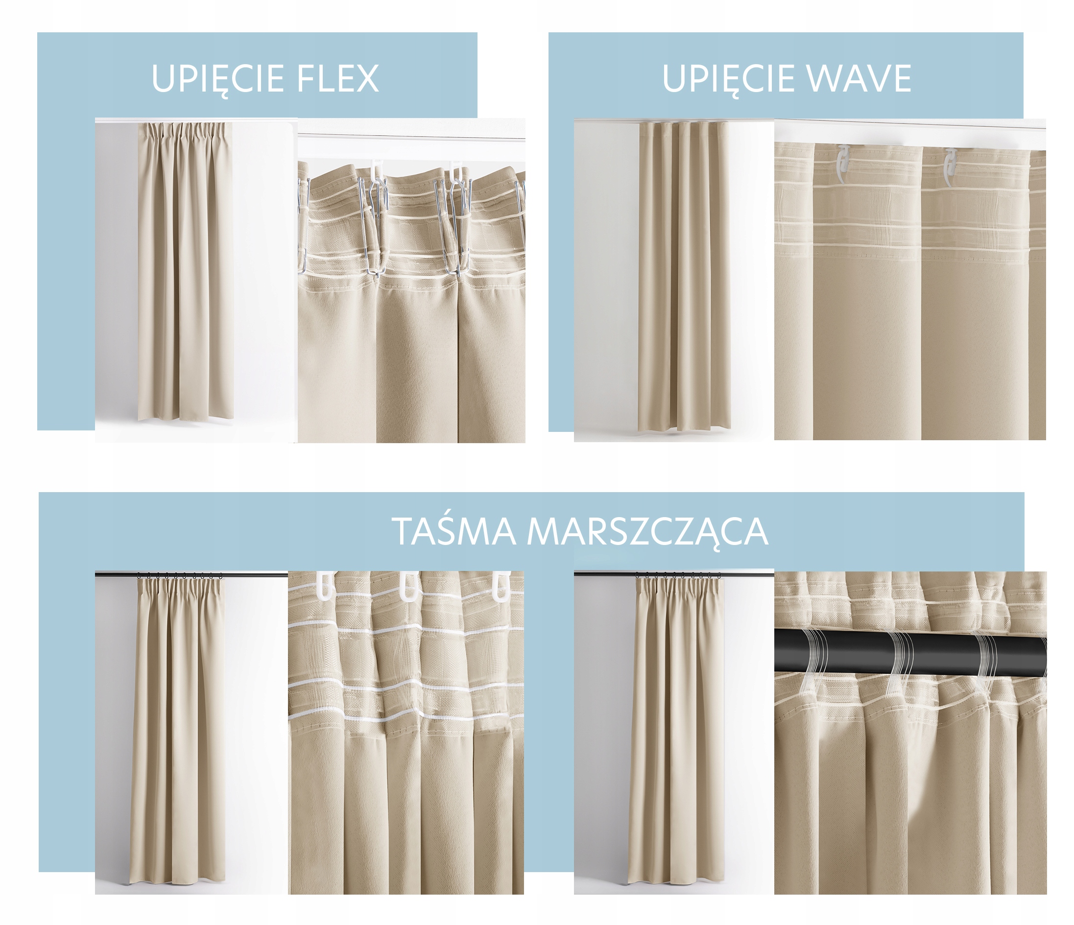 - багатофункціональна стрічка-хвиля - дозволяє різні способи підвішування штори: підвішування на хвилі, вставлення штори в трубу, зминання стрічки та підвішування штори на гачки, підвішування штори на флекс гачки,