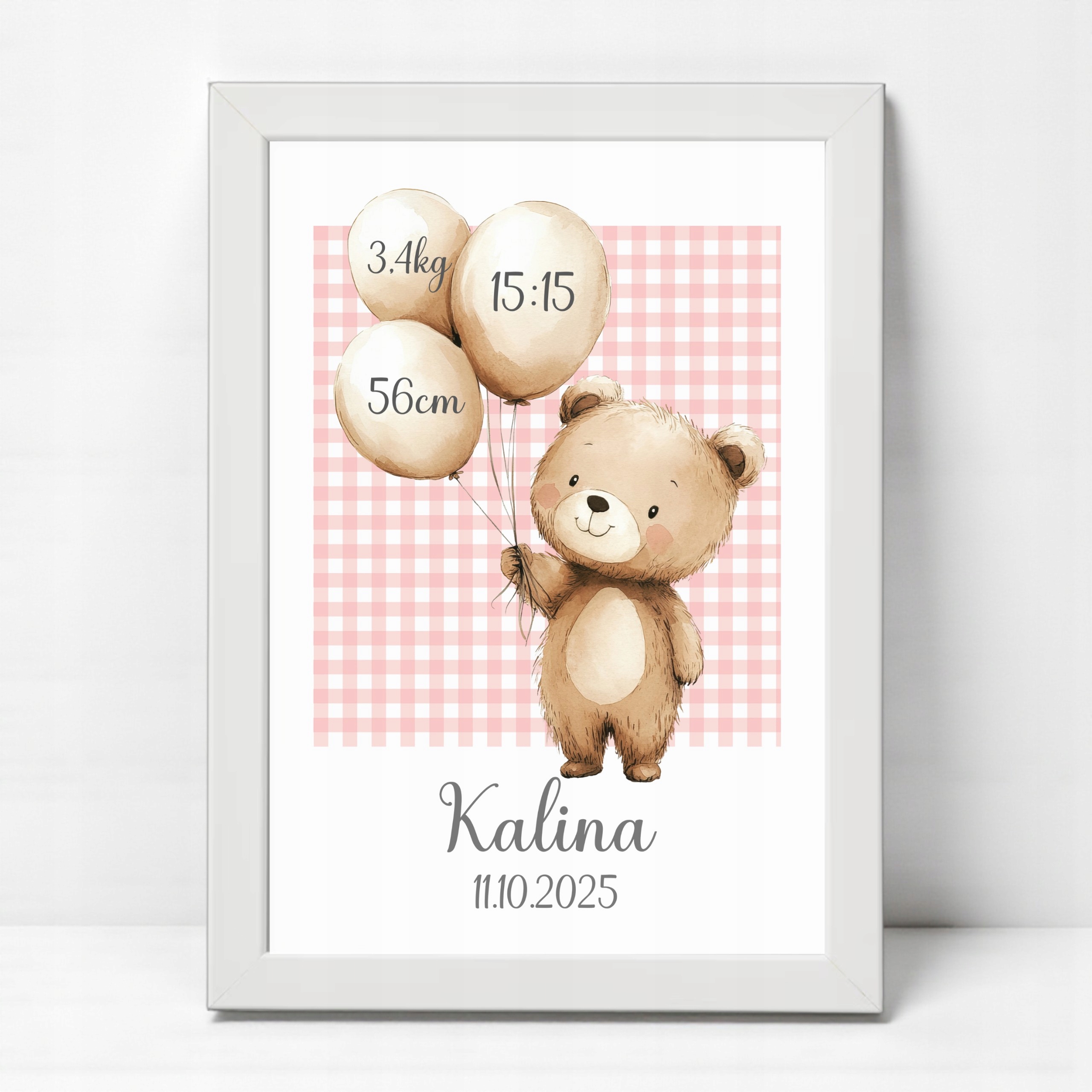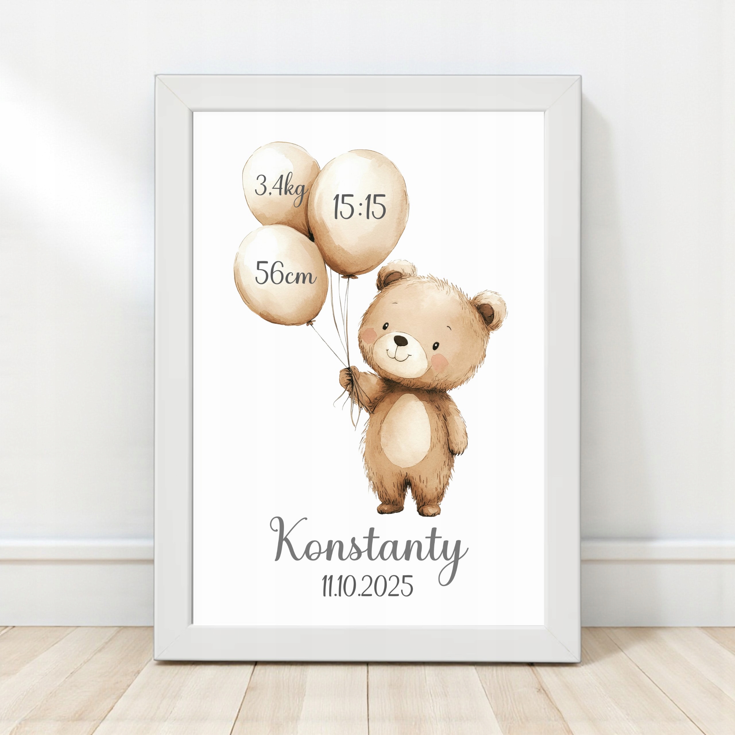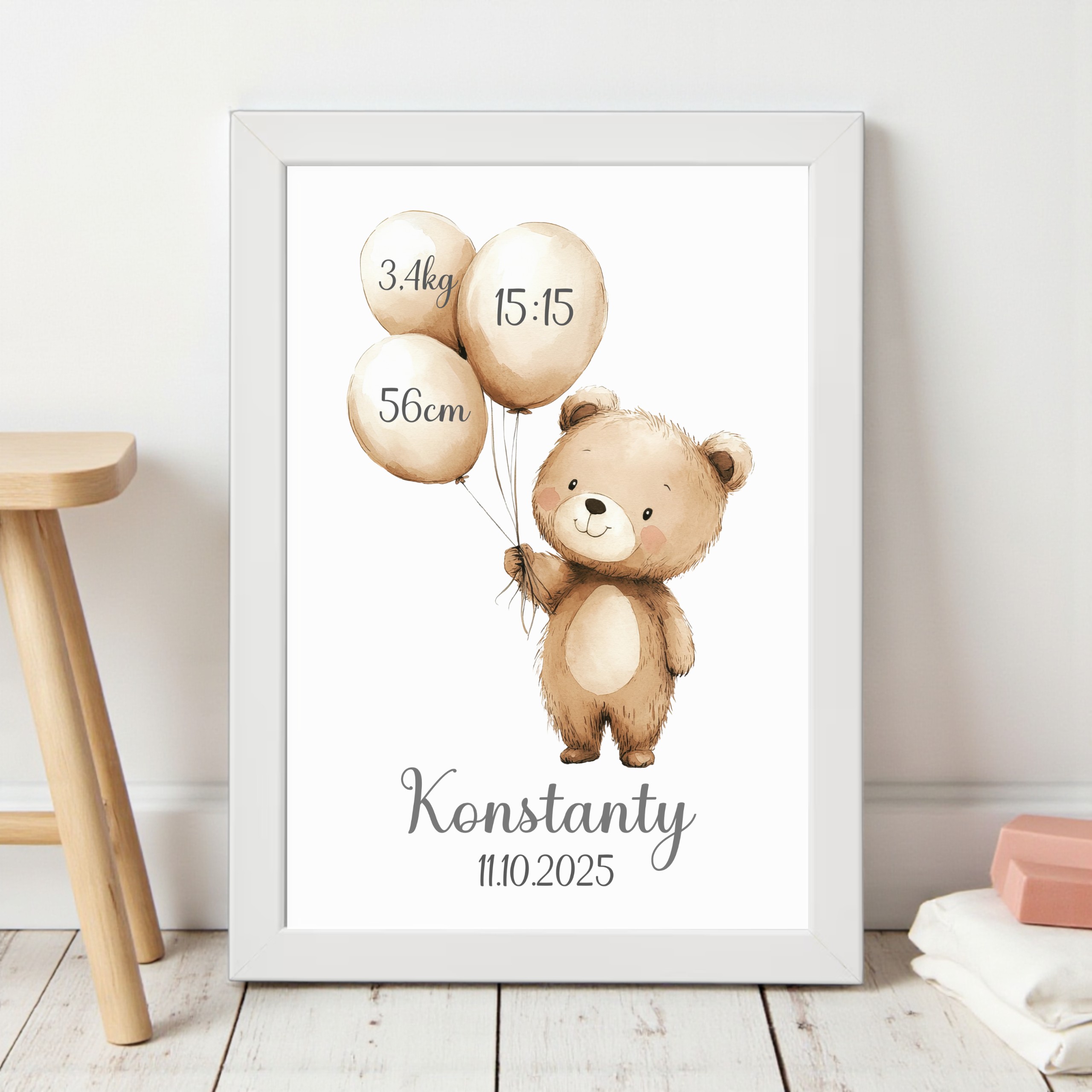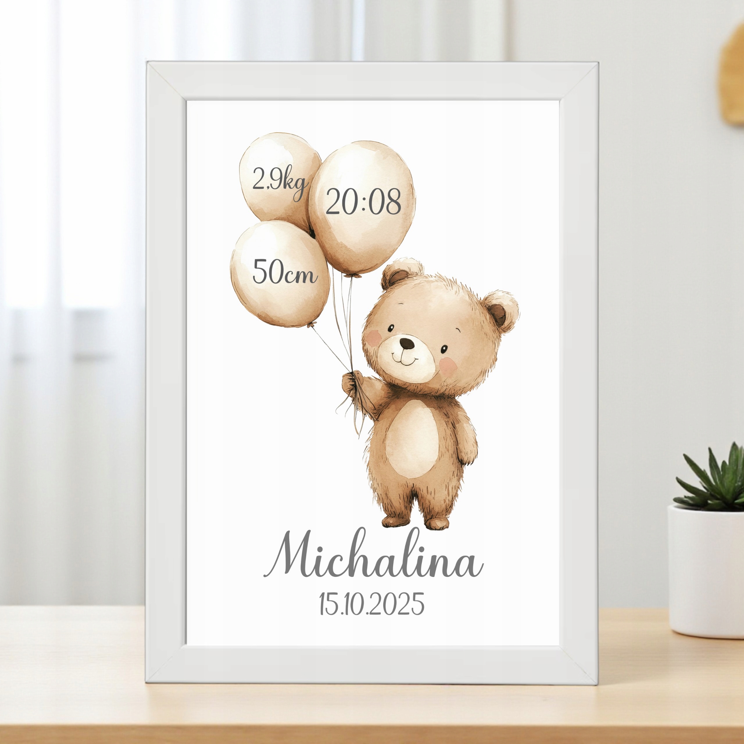 РЕЄСТРАЦІЯ ДИТИНИ ВЕДМЕДИК І ПОВІТРЯНА КУЛЯ - ПЕРСОНАЛІЗОВАНА КАРТИНА А4 + РАМКА IKEA FISKBO