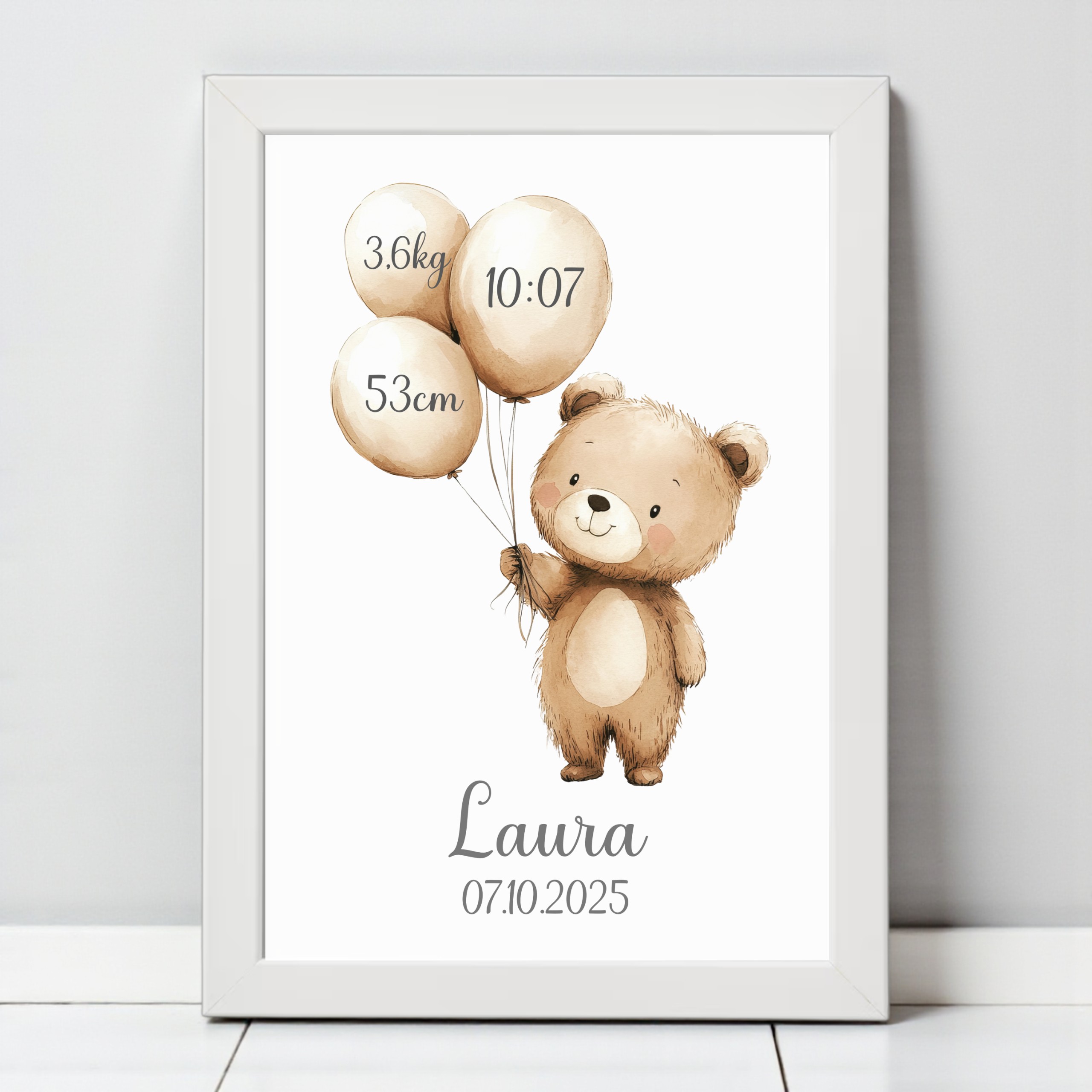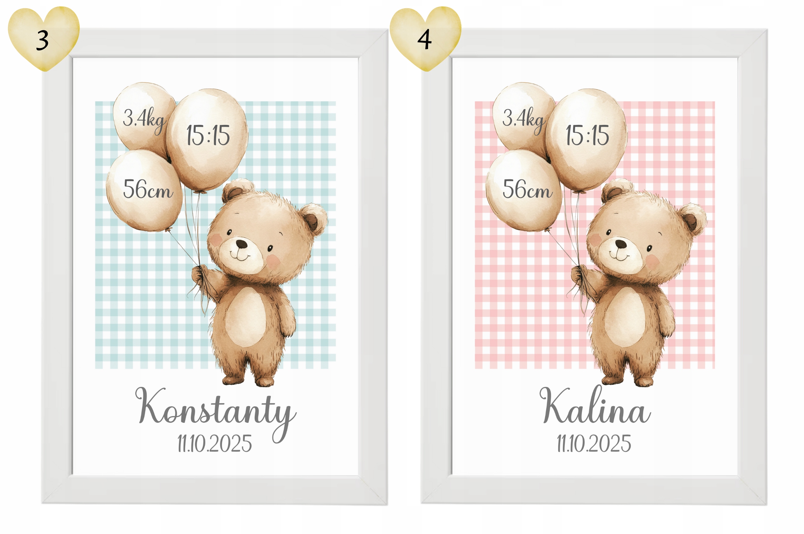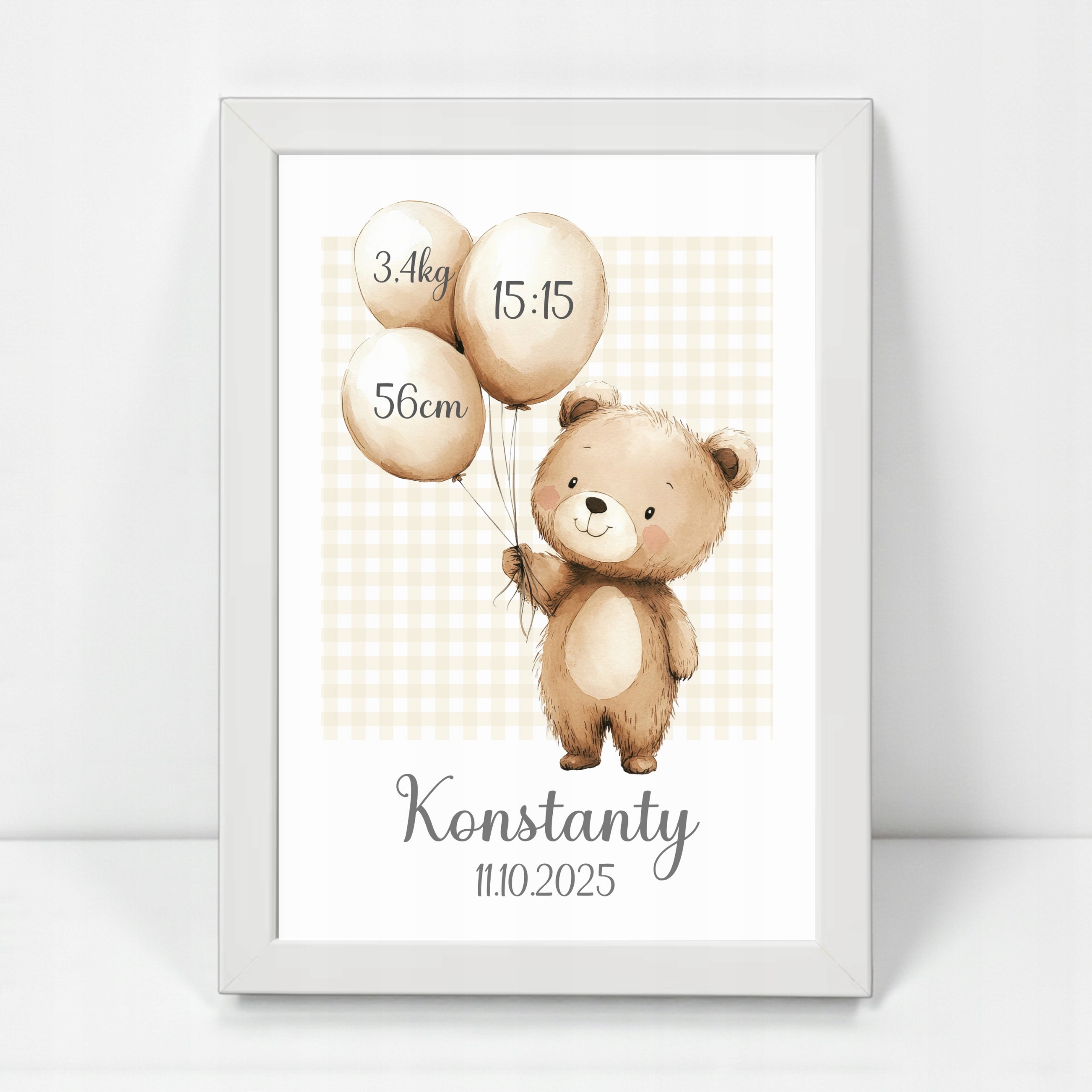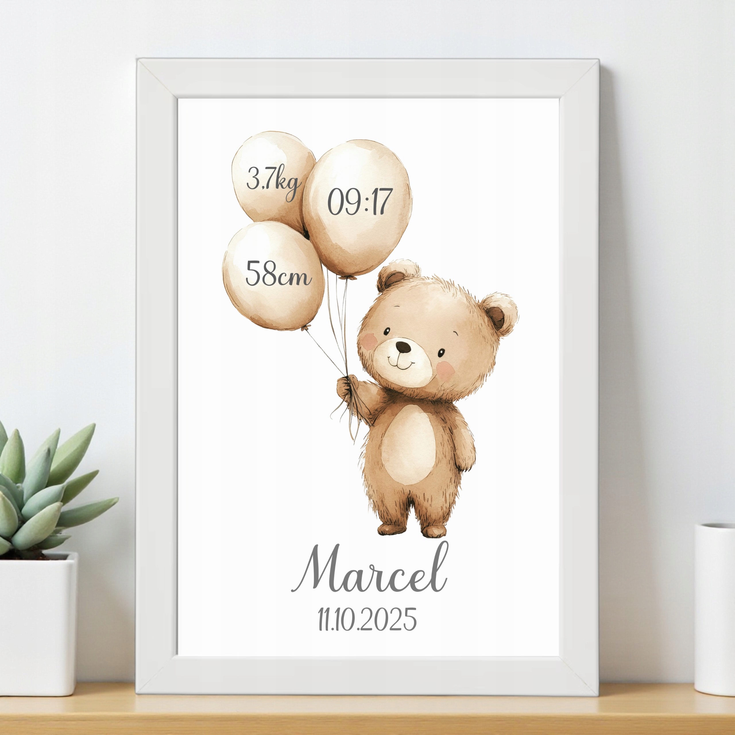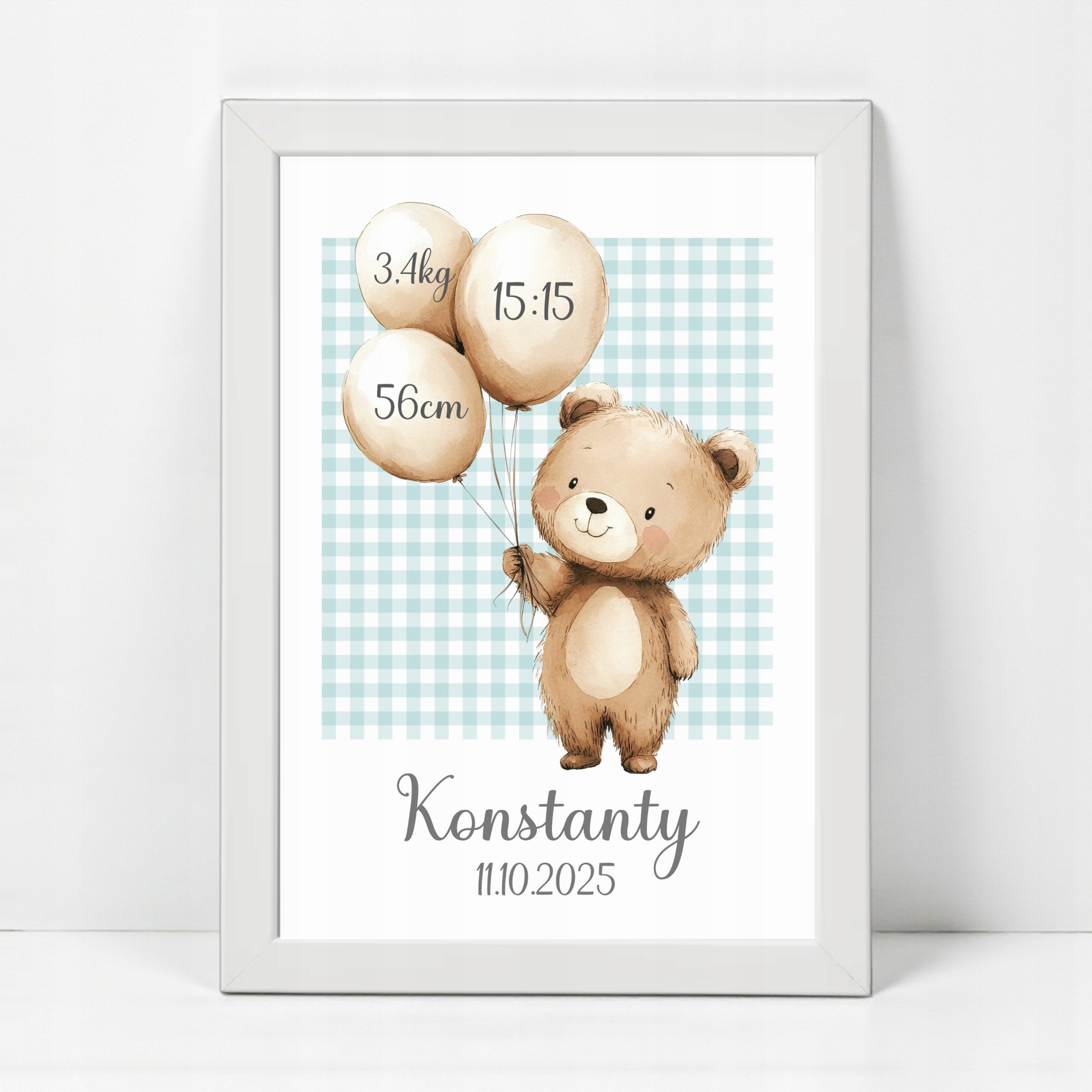 РЕЄСТРАЦІЯ ДИТИНИ ВЕДМЕДИК І ПОВІТРЯНА КУЛЯ - ПЕРСОНАЛІЗОВАНА КАРТИНА А4 + РАМКА IKEA FISKBO