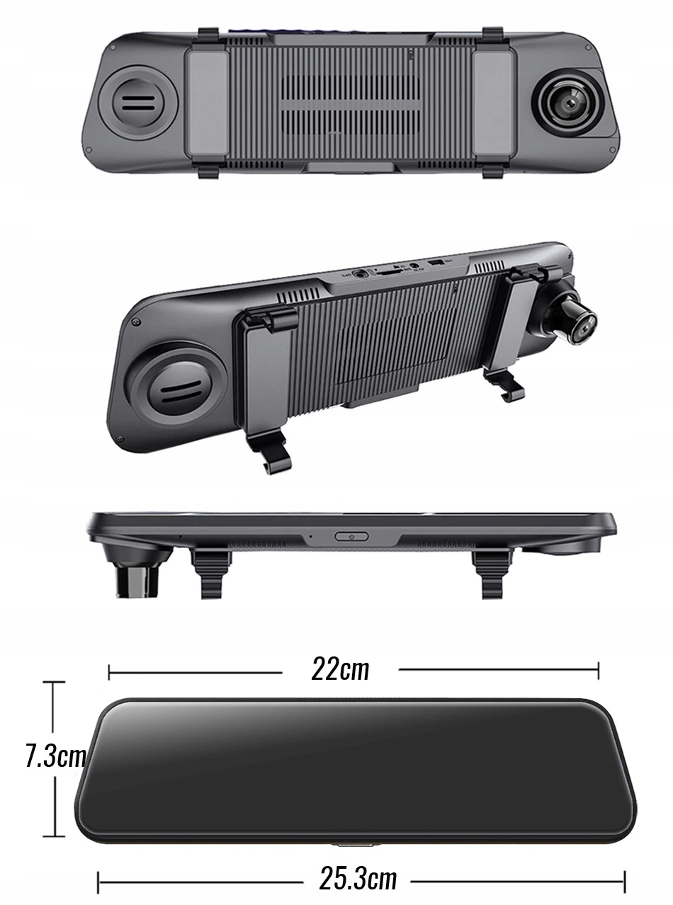 DVR дзеркало заднього виду (6 м кабелю або 10 м за додаткову плату), відеореєстратор, камера заднього виду Sony IMX323, Android 8.1, ЦП (4 ядра) SL8541E @ 1,4 ГГц, GPU Mali880@680 МГц, RAM : 2GB, ROM: 16GB, micro SD max 128GB,10" сенсорний дисплей, GPS-локатор, навігація, камера, автозапуск, датчик руху, запис звуку , 10" сенсорний дисплей, GSM 4G, 3-осьовий датчик G-Senor, режим паркування, циклічний запис, гарнітура, вбудований мікрофон і динамік, вбудований модуль Wi-Fi, пристрій для читання карт пам'яті TF/SD, FM-трансмітер, роз'єм mini USB, кут сприйняття фронтальної камери - 170°, тильної камери - 140°, підтримка програм голосової допомоги, ADAS, IP-камера, віддалений моніторинг, WDR, HDR