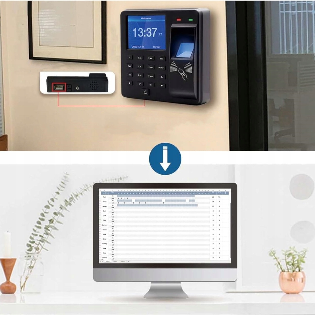 Підтримує відбиток пальця, пароль і картку/брелок RFID 125 кГц для ідентифікації відвідуваності. Виберіть бажаний спосіб. Звіти Excel також можна завантажувати та завантажувати через USB-накопичувач, щоб перевіряти відвідуваність щотижня, раз на два тижні, півроку та щомісяця.