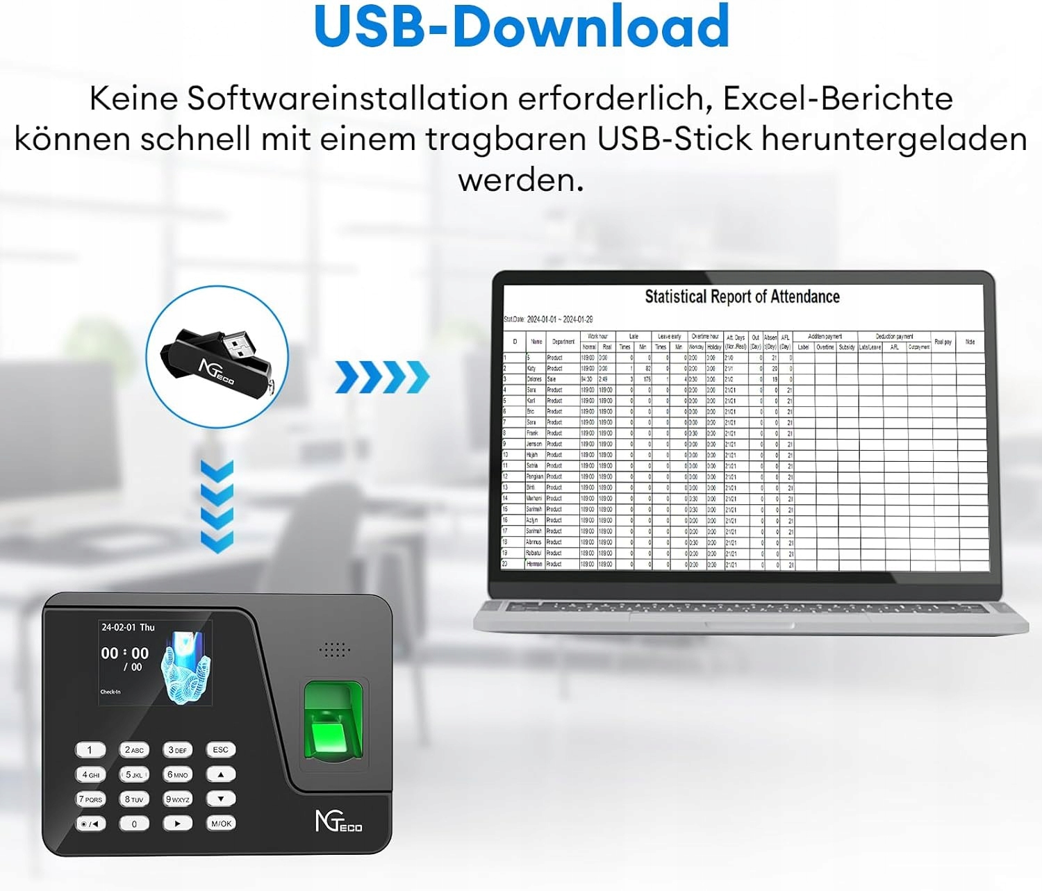 - Велика ємність: машина обліку робочого часу NGTeco може зберігати до 1000 відбитків пальців і 50 000 записів, що робить її ідеальною для малих і середніх підприємств із кількістю співробітників до 1000 осіб.