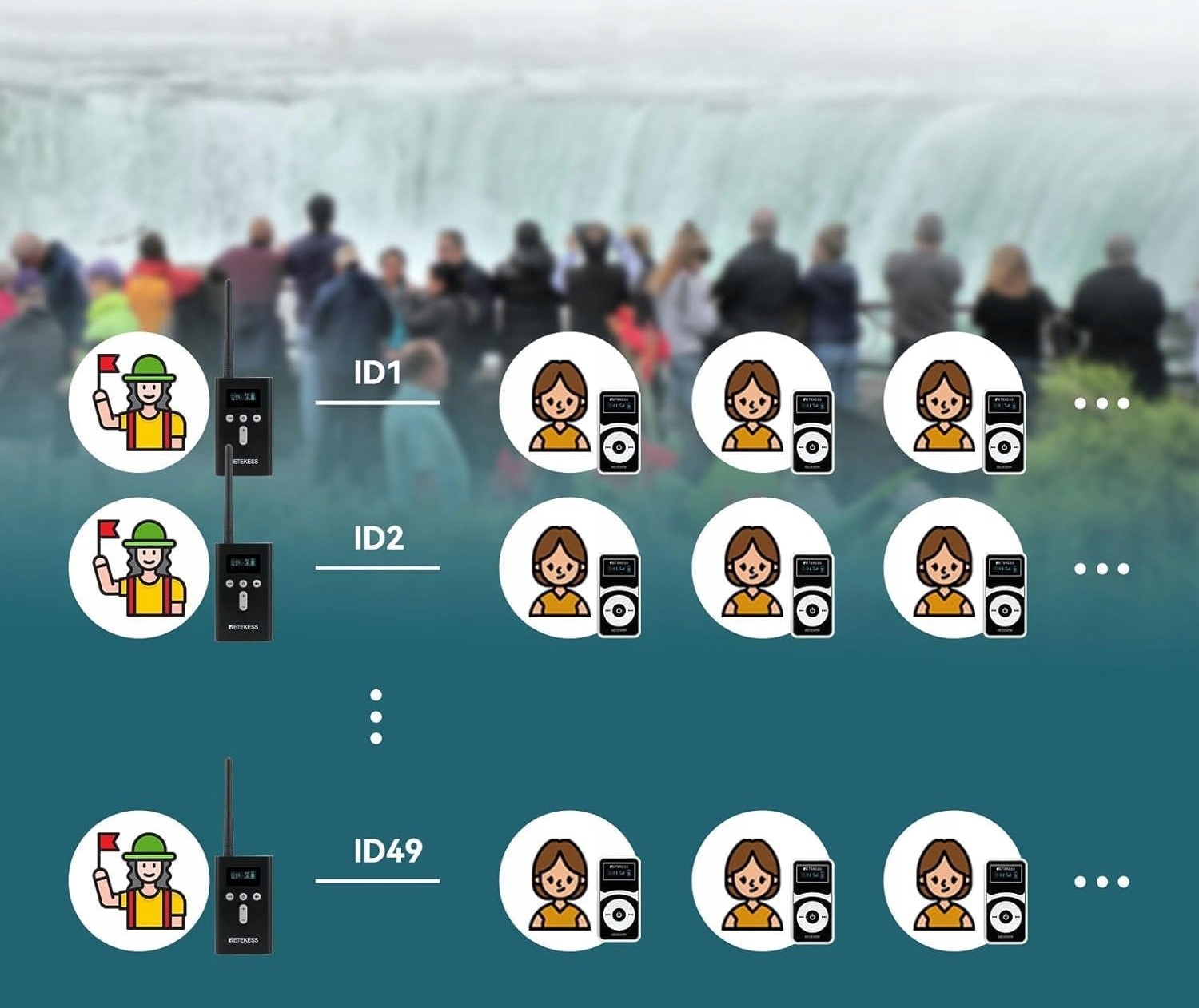 Професійна система бездротового зв’язку з мікрофоном і приймачами — ідеальна для гідів, музеїв, конференцій, тренінгів, групових поїздок, польових заходів і заходів, де важливі чітка передача та комфорт прослуховування.