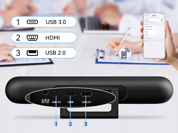 - Пристрій повністю підтримує різні методи підключення, зокрема порти HDMI, USB 3.0 і підключення Bluetooth 5.0, а також сумісний із основними операційними системами (WIN, MAC, LINUX) і програмним забезпеченням для конференцій.