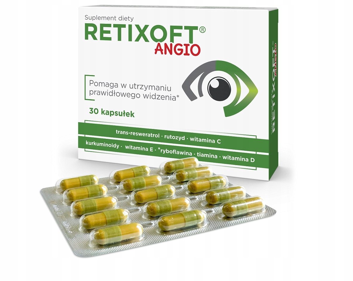Retixoft Angio — це дієтична добавка, що містить, серед іншого: формула спеціально підібраних активних інгредієнтів, включаючи транс-ресвератрол, рутозид і вітамін С. Вітамін С підтримує належне вироблення колагену для забезпечення належного функціонування кровоносних судин. Крім того, дієтична добавка Retixoft Angio містить інгредієнти з підтвердженою антиоксидантною дією: куркуміноїди, вітамін Е та рибофлавін, який також допомагає підтримувати правильний зір.Призначення продукту