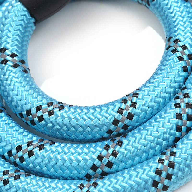 Повідець виготовлений з нейлону. Нейлон - це синтетичне волокно, яке є дуже міцним і стійким до стирання. Повідець виготовлений з круглої тасьми. Це дає вам впевненість у тому, що повідець – це повідець, який ви можете використовувати знову і знову. Повідець виготовлений з міцного матеріалу, нейлону, також відомого як альпіністська мотузка, і дуже міцного металевого карабіна. Тому поводок підходить для великих і середніх порід.