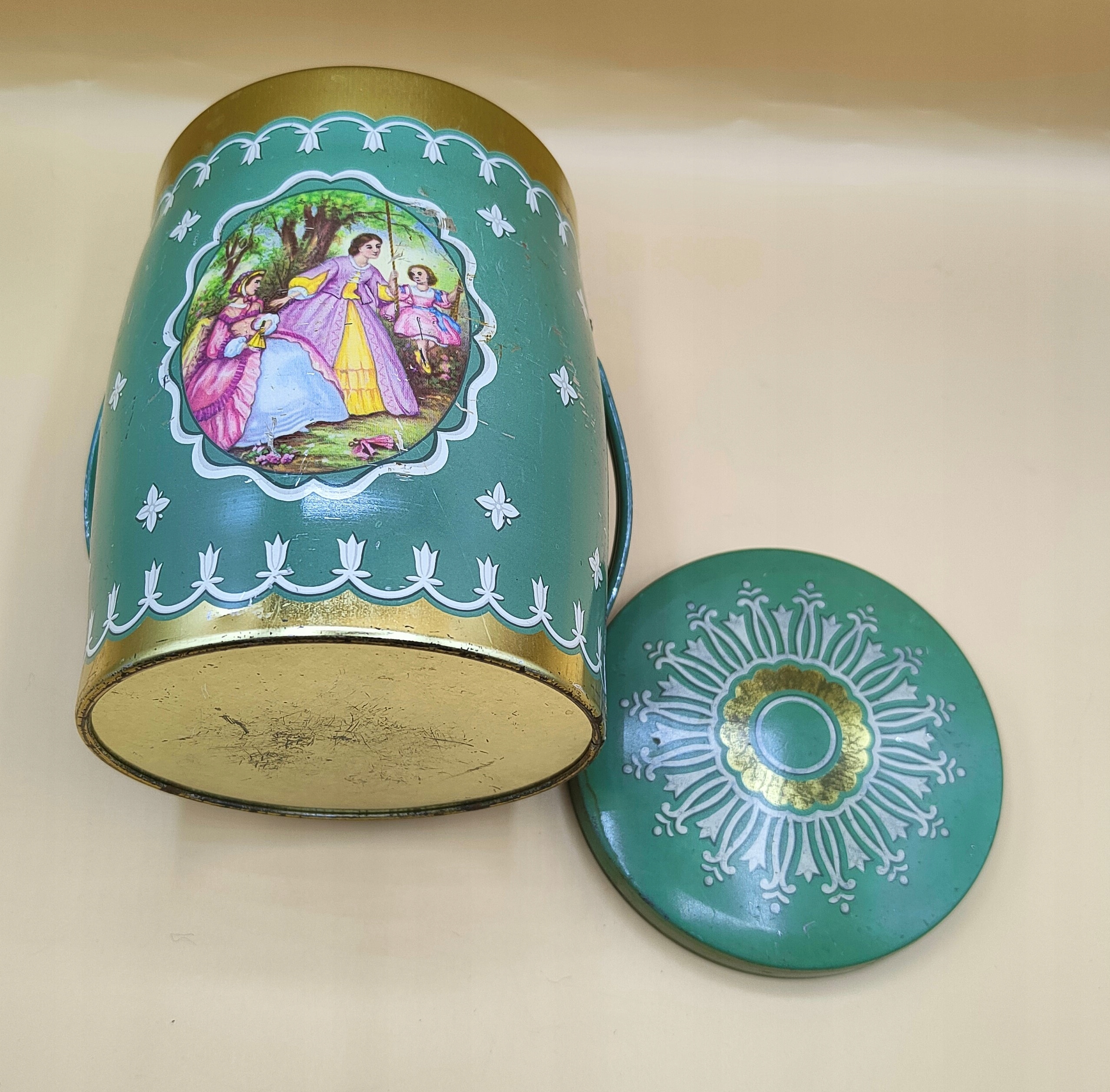 Чудова РЕТРО банка, дві дами з дитиною на дитячому майданчику. Бідон/відро з ручкою.