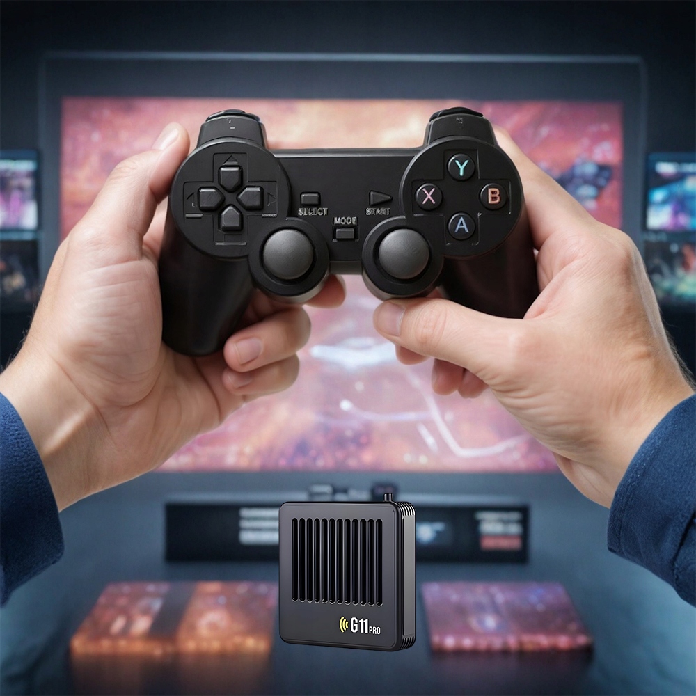 Невеликий розмір означає, що ви можете брати G11 Pro будь-куди – у рюкзаку, сумці чи валізі. У набір входить 2 бездротових контролера, які дозволяють грати з сім'єю або друзями в будь-якому місці. Чудова ідея подарунка для дітей, дорослих і шанувальників ретро.