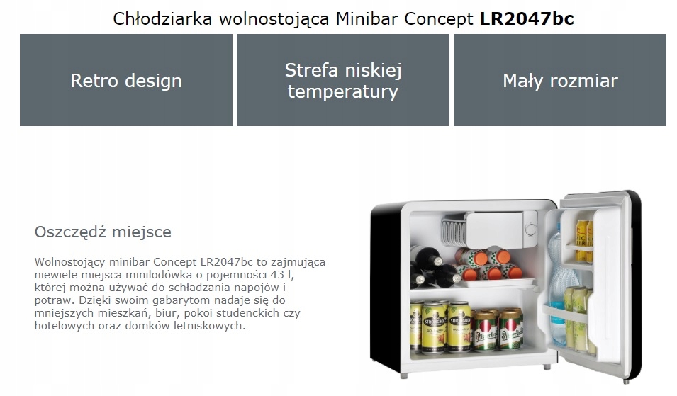 Окремо стоячий міні-бар Concept LR2047bc — це компактний міні-холодильник об’ємом 47 літрів, який можна використовувати для охолодження напоїв і їжі. Завдяки своїм розмірам він підходить для невеликих квартир, офісів, студентських чи готельних номерів і літніх будинків.