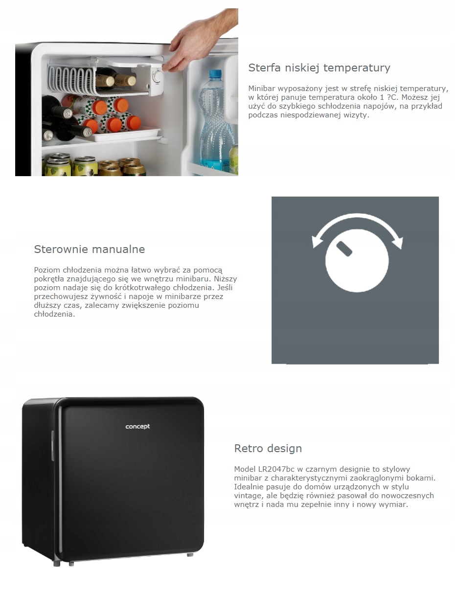 ✅Окремо стоячий міні-бар Concept LR2047bc у стилі ретро – це компактний міні-холодильник об’ємом 47 літрів із зоною низької температури для швидкого охолодження напоїв.